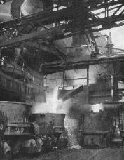 Pour produire 1000 kg de fonte il faut 3000 kg de minerai et 1000 kg de coke. Le laitier provenant de la gangue est plus abondant que la fonte. La fonte est acheminée vers le mélangeur de l'Aciérie, le laitier est en partie réutilisé (cimenterie - briquerie ...) Coulée d'un haut fourneau A gauche le laitier dans une cuve A droite la fonte dans une poche de 50 tonnes |