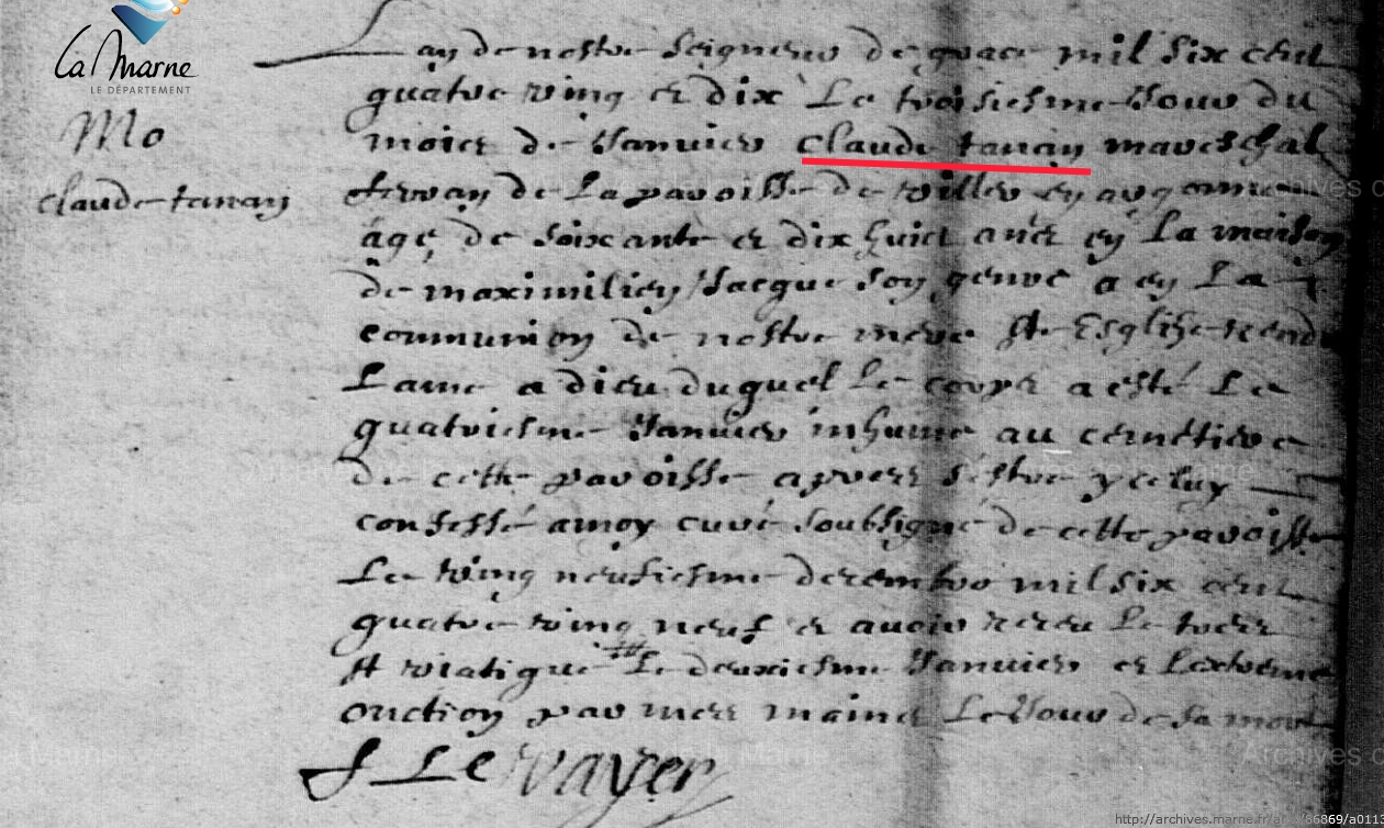 Naissance : calculée 1612 Décès : 3 janvier 1690 à Villers-en-Argonne 51800 ( Source )