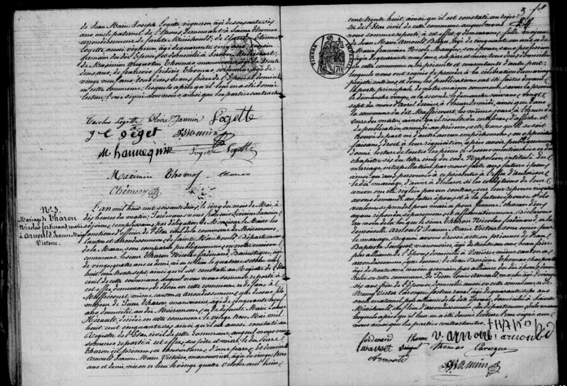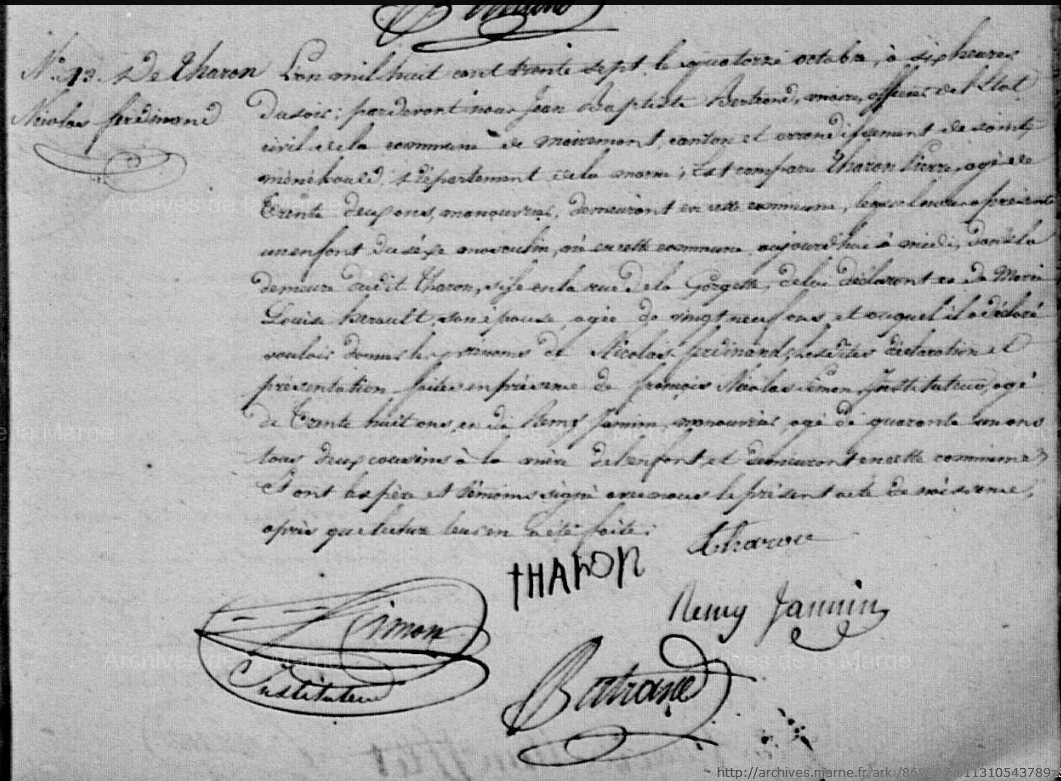 Déclarants : Tharon Firmin Julien, 36 ans, domestique de La Neuville au Pont, fils, et Chauffert Louis Firmin, scieur de long, 53 ans, beau frère
