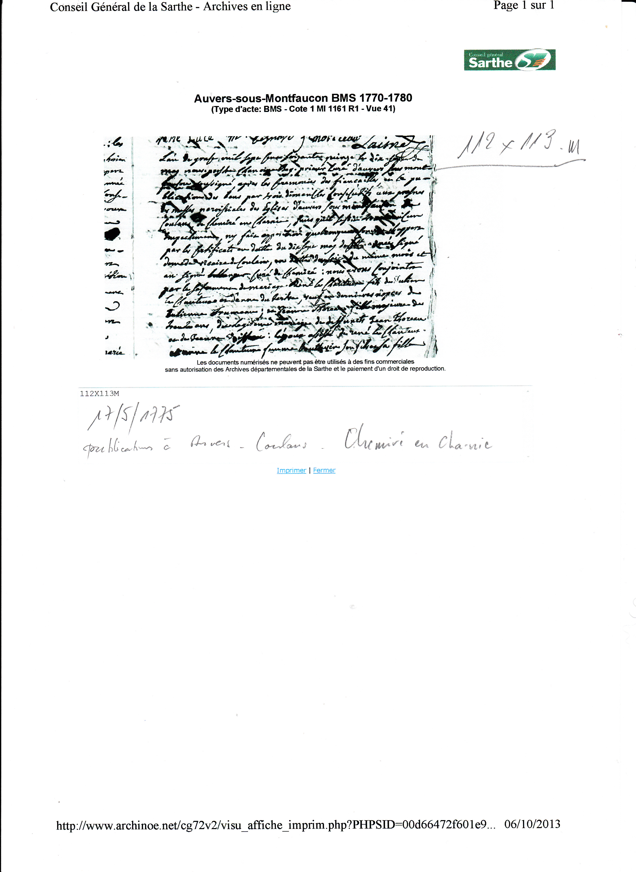 Mariage : 17 mai 1775 à Auvers sous Montfaucon 72540 ( Source )