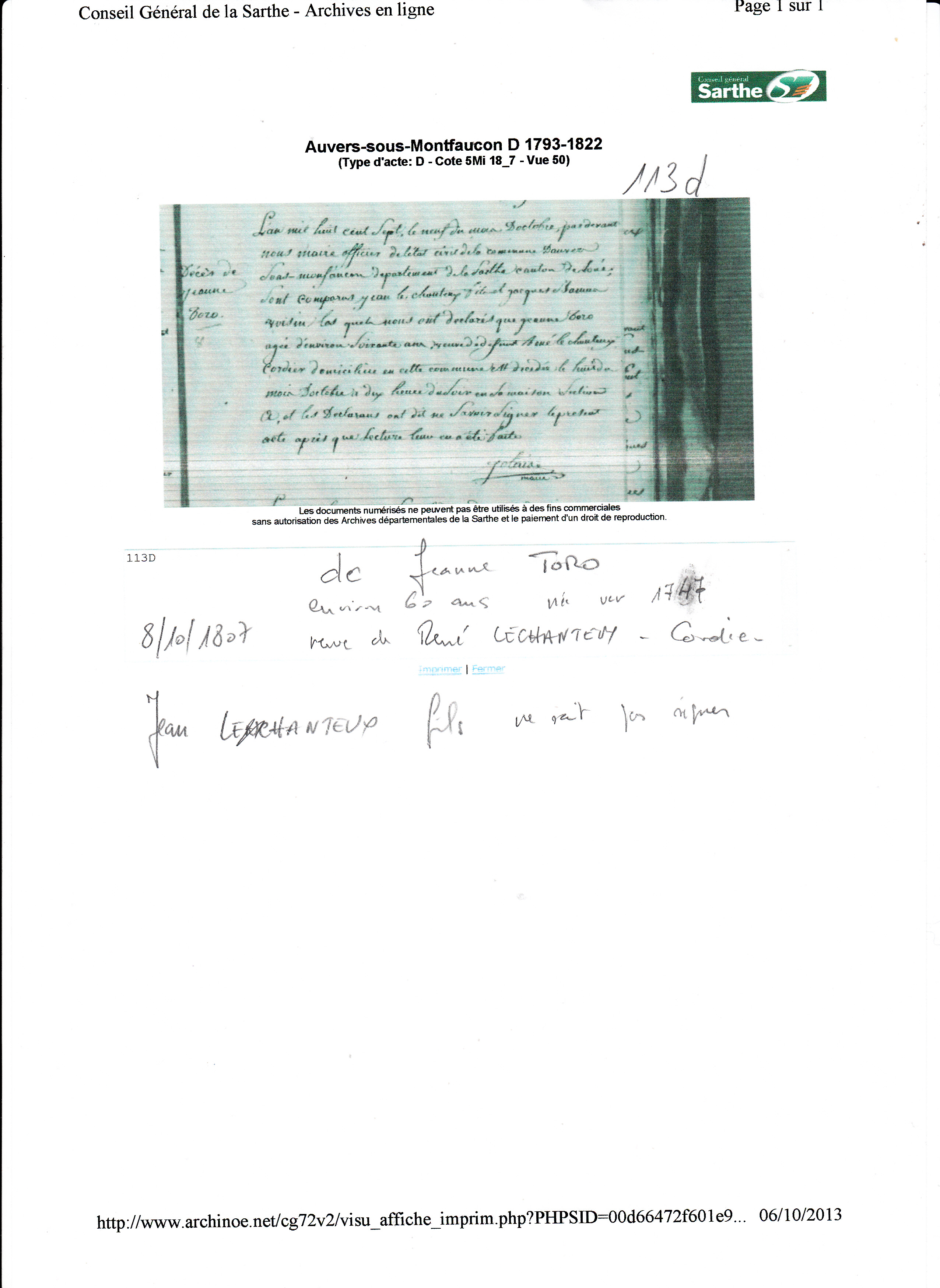 pas chemiré en charnieDécès : 8 octobre 1807 à Auvers sous Montfaucon 72540 ( Source )