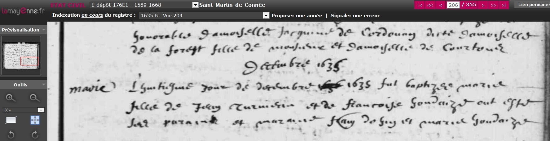 Naissance : 8 décembre 1635 à Saint-Martin-de-Connée 53160 ( Source )