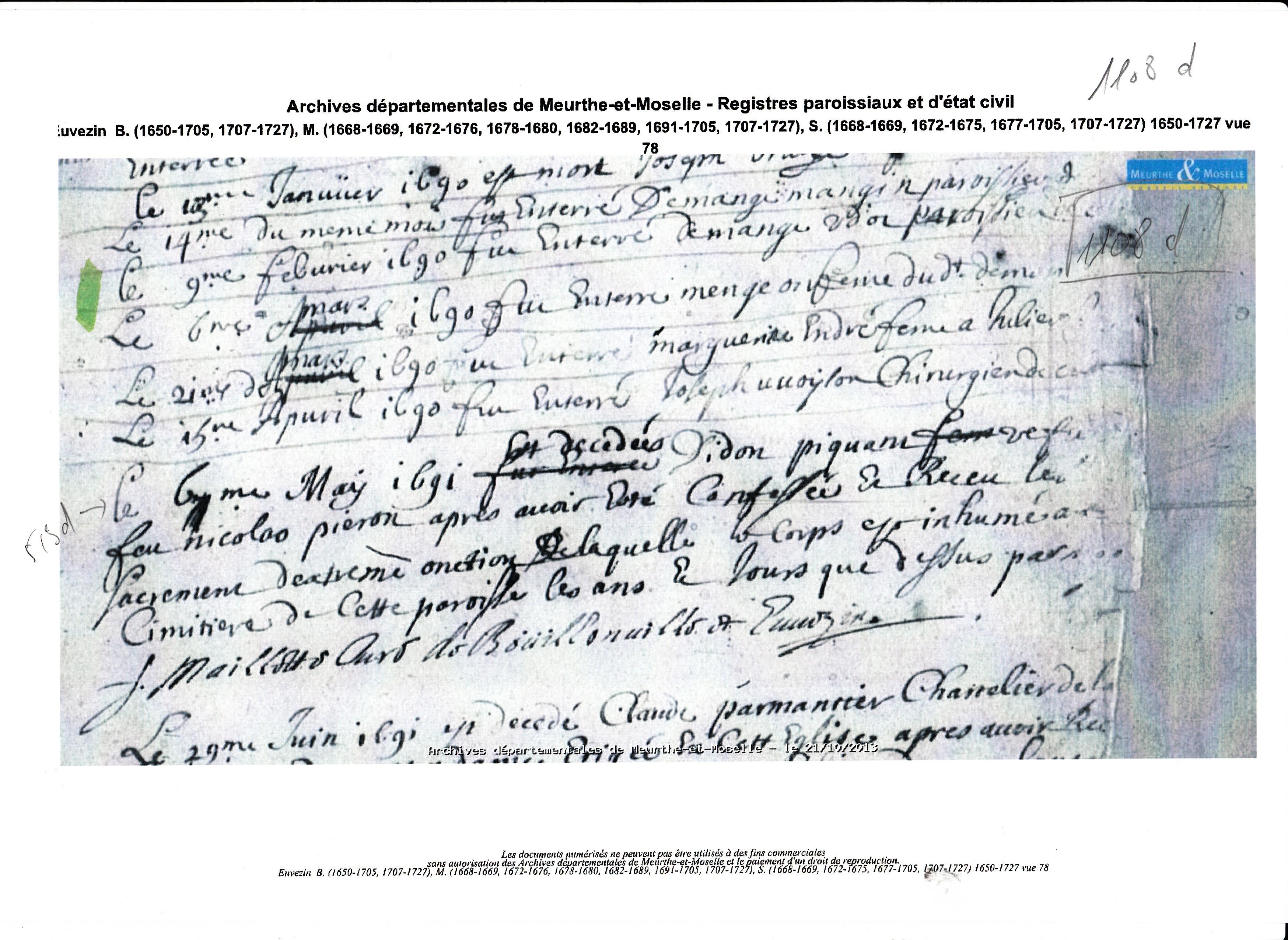 Mère : MONNOYOT Claudette ( ~ 1660 - <> 1726 & 1739 )