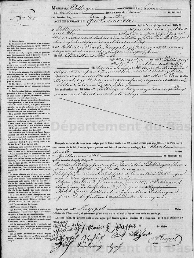 Mariage : 30 mars 1835 à Dehlingen 67430 Alsace ( Source )