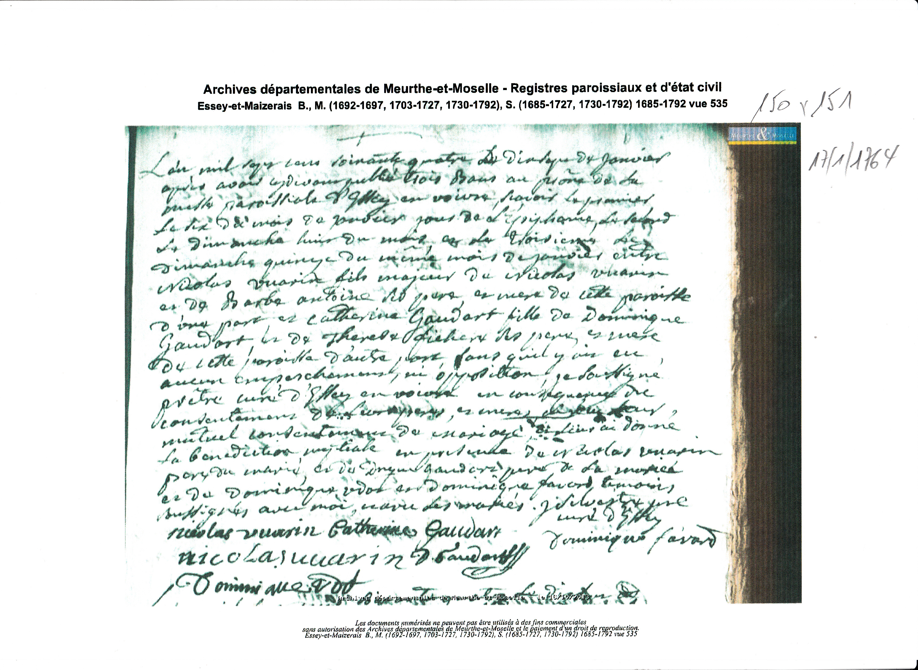 Mariage : 17 janvier 1764 à Essey et Maizerais 54470 ( Source )