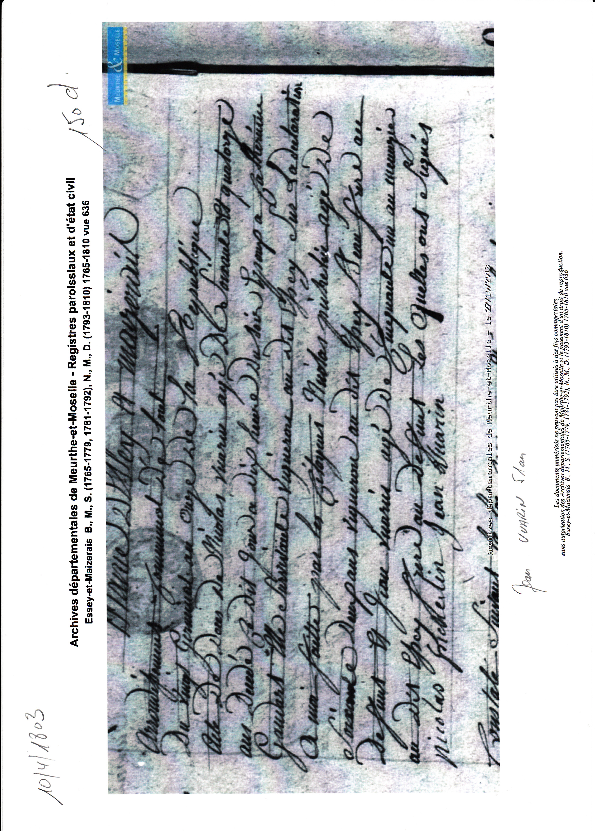 A confirmer manque actes mai 1727 à juin 1730Décès : 10 avril 1803 à Essey et Maizerais 54470 ( Source )