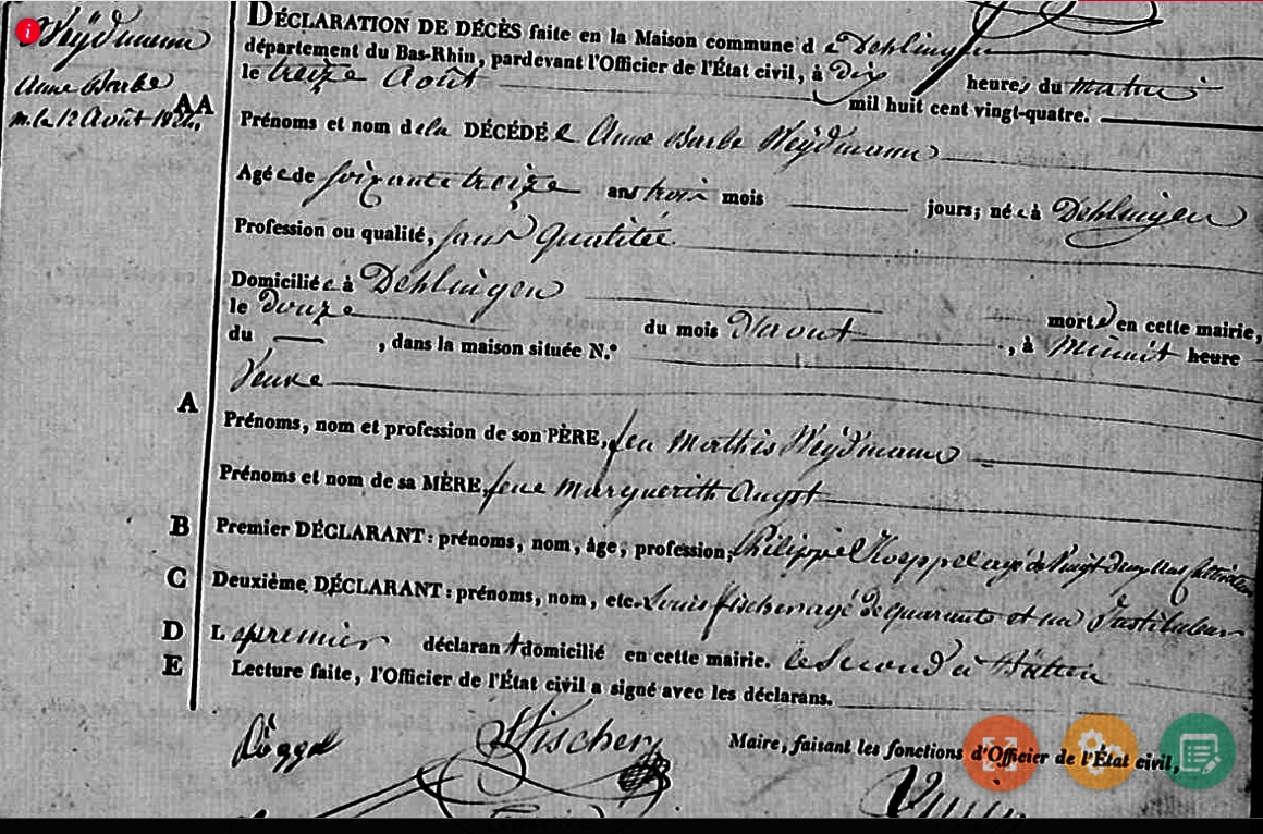 Décès : 12 août 1824 à Dehlingen 67430 Alsace ( Source )