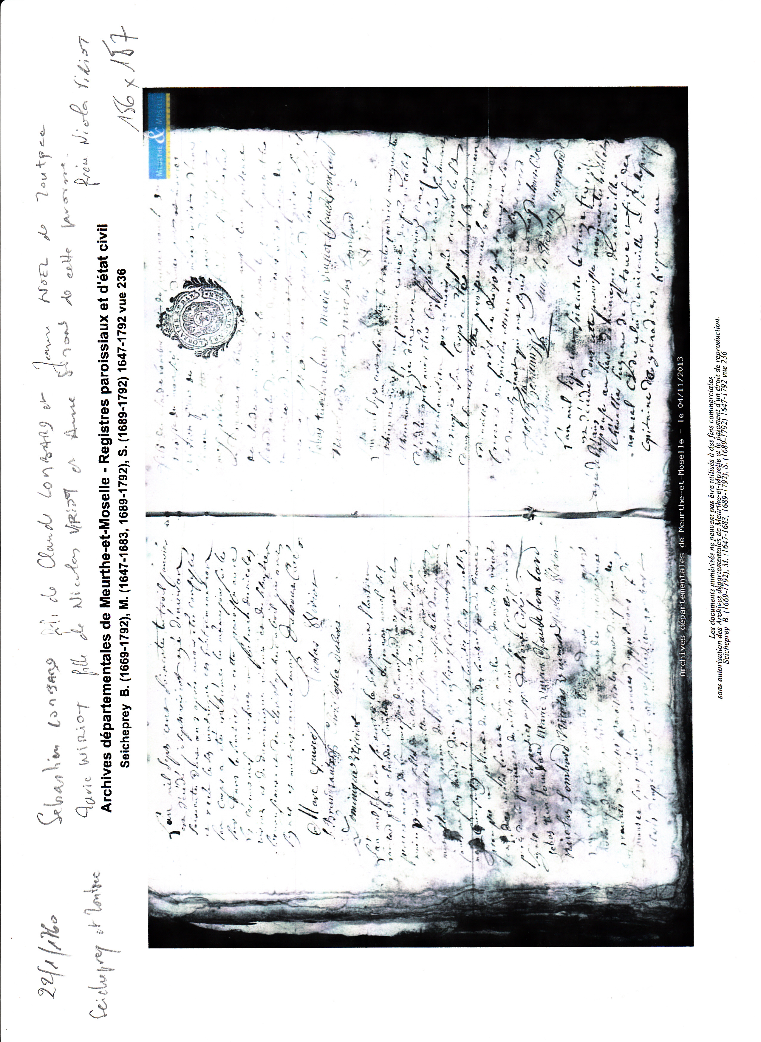 Mariage : 27 novembre 1676 à Seicheprey 54470 ( Source )