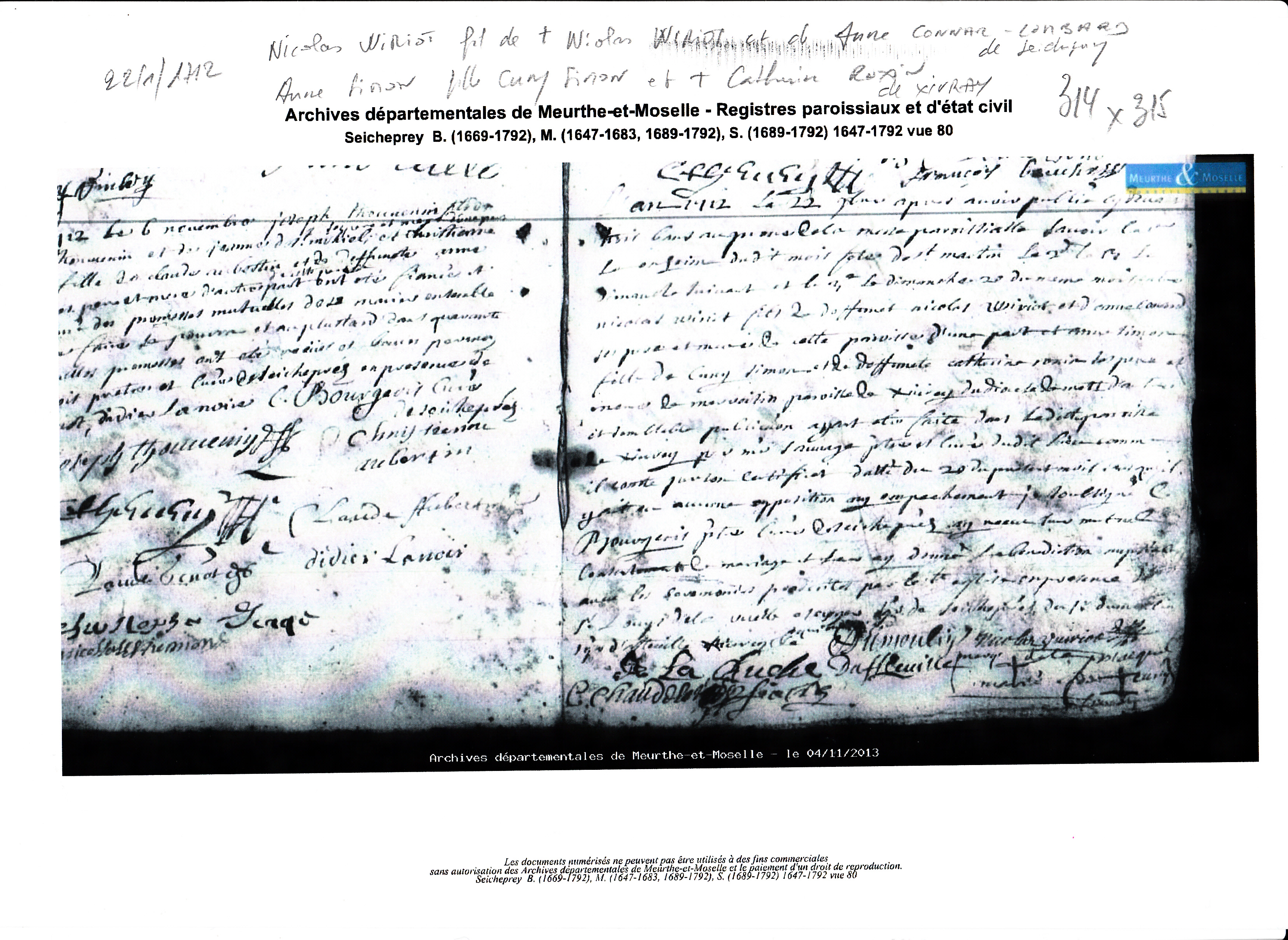 Mariage : 22 septembre 1712 à Seicheprey 54470 ( Source )