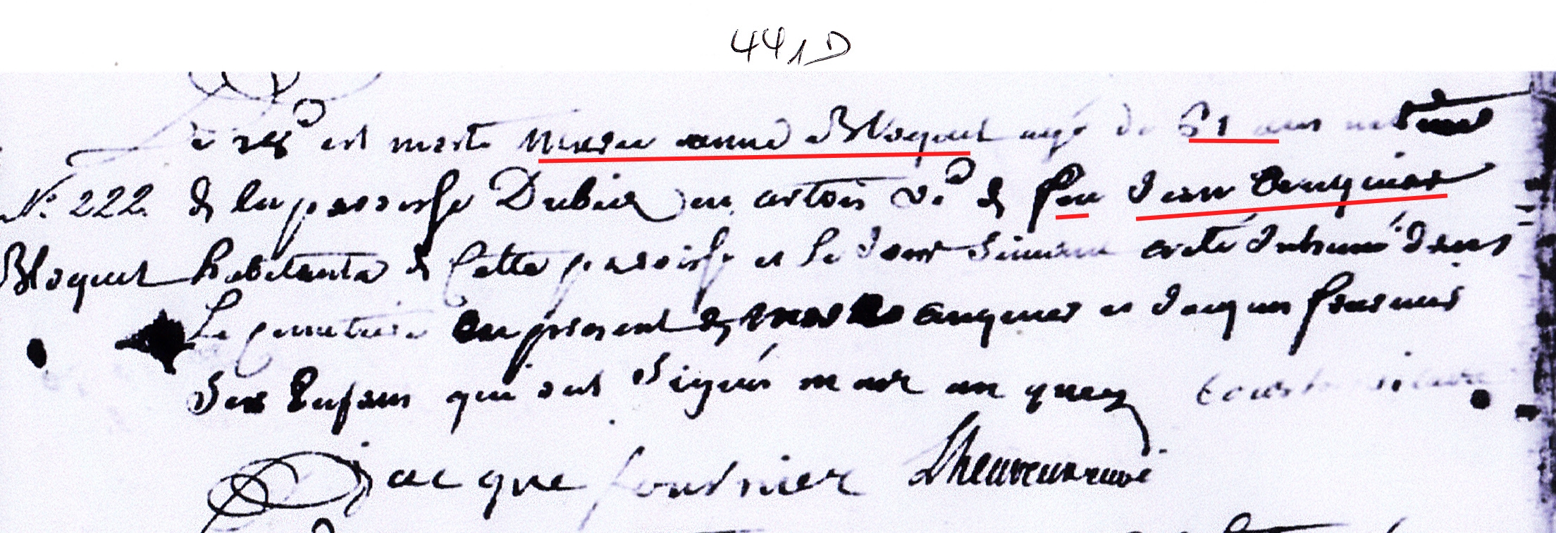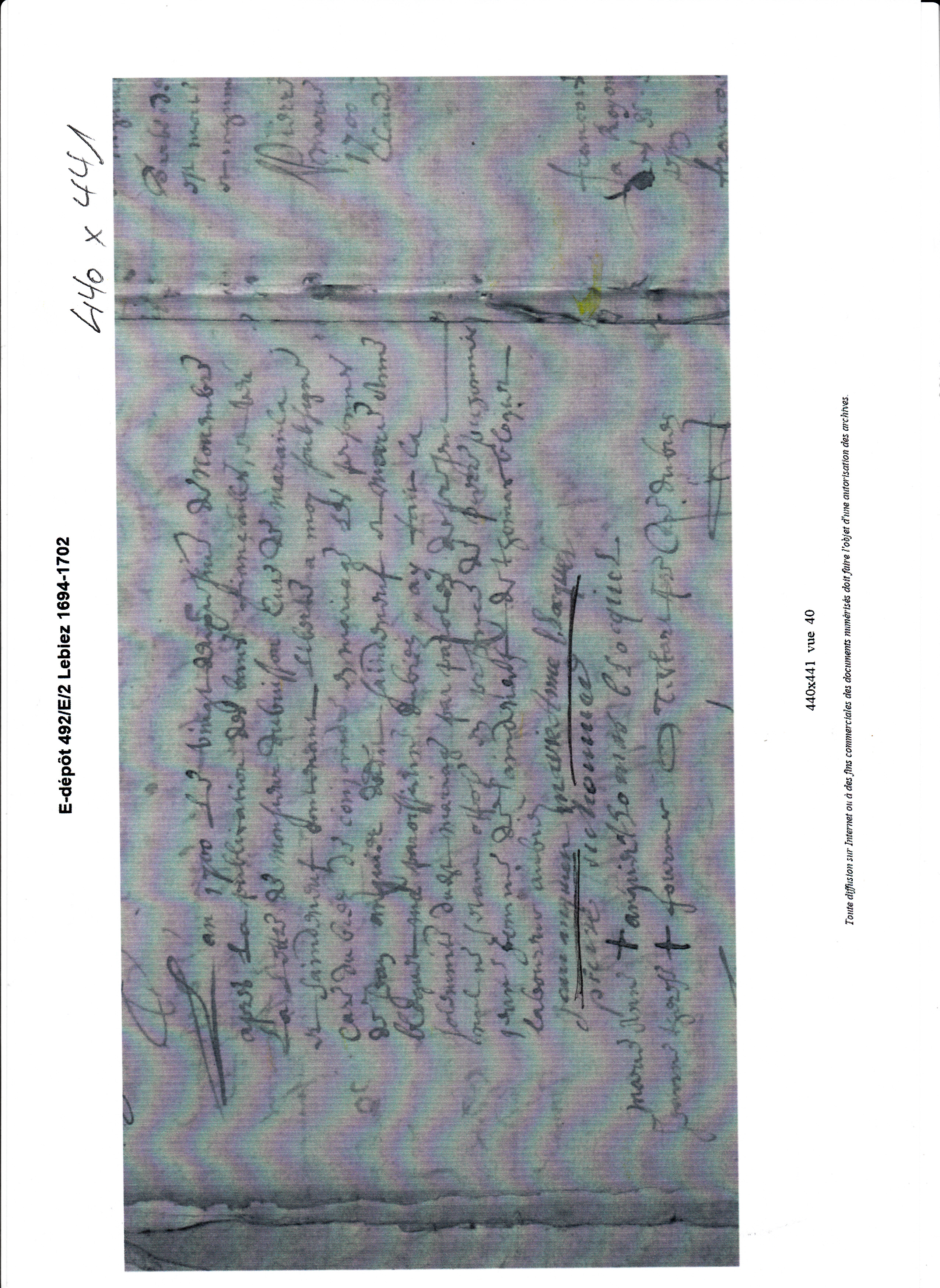 Comparurent en leurs personnes Jean Anquier fils à marier de Claude et de deffuncte Marie Maguenghen assisté dudit Claude son pere, de Joseph Rolland et Caterine Anquier sa femme soeur dud. Jean, d'Antoine Labbé mari et bail de Marie Anquier aussy soeur dud. Jean, de Jean Beaugrand son cousin remué de germain, d'Adrienne Anquier sa soeur à marier et de Guillaume Deleporte laboureur tous demeurans au village de Saint Deneouf sauf led. Beaugrand quy demeure à Marenla d'une part, Henry Bloquel laboureur et Marie Anne Brebion sa femme qu'il auctorize à l'effect des prtes et Marie Anne Bloquel leur fille à marier d'eux assisté, de Charles Brebion son pere grand demeurant au village du Biez, de Mre Charles Bloquel pbre son frere demt à Aubercourt, de Thomas, Francois, Ferdinand, Claude, Jeanne et Caterine Bloquel tous freres et soeurs de la ditte Marie Anne, de Jean Therouanne et Marie Jeanne Bloquel sa femme qu'il auctorize à l'effect des prtes aussy sa soeur, de Lievin Brebion son oncle, de Mre Omer Testart pbre curé dud. Biez, de Marie Bloquel veuve de Pierre Bochu? sa tante et austres ses bons amys d'autre part, et recognurent les parties comparantes que pour parvenir // au traittâe de mariage convenus entre lesd. Jean Anquier et laditte Marie Anne Bloquel quy se fera en face d'eglise, d'avoir accordé les clauses dispositions et stipulaons suivantes scavoir, quant au portement dud. Jean Anquier futur mariant iceluy a declaré luy competter la moitié d'un mannoir amazé de maison et austres edifices allencontre dud. Claude son pere proceddans du chef de lad. Maguenghen sa mere, item led. Claude Anquier donne aud. Jean son fils futur mariant l'autre moitiâe dud. mannoir et amazemens, scitué led. mannoir aud. lieu de St Denoeuf tenant d'un liste à Jacques Pichonnier d'autre à Jacques Pruvot des deux bouts au flegard pour de la totalité dud. man. et amazemens en jouir par led. futur mariant du jour du mariage consommé en avant heritablemt et à toujours à charge des rentes fonsieres seulement ensamble de vingt cinq livres de somme pr[inci]pal afferante à la part dud. Claude Anquier fesant partie de plus grande somme courans áa rente au proffit du sieur de Soigny et des comtes à l'advenir des dittes vingt cinq livres decharger de tous arrerages debtes et hipotecques quelconques jusqu'au jour d'entré en jouissance, item led. Claude Anquier donne en advanchemt d'hoirie à sond. fils futur mariant tous les ustensils convenables au metier de mareschal à l'exception d'une englume à le tout livrer à la volonté dud. mariant, item luy donne un cheval entier de poil noir et une cavalle de mesme poil, item une vache et un veau six bestes à laine quatre cochons à prendre en ceux qu'il a en sa possession, un cent de bled en jarbe, un cent de warats de veches, un demy cent d'avoine, un quarteron de warats de bizailles à le tout livrer instament ce mariage consommé, item donne un chariot tout monté à l'exception des deux roues de derriere à livrer après aoust prochain, item une charüe noeuve sans estre ferré à livrer apres ce mariage consommé, item deux journeux de bled áa present croissant pour despouillier au mois d'aoust prochain lesd. deux journeux en une piece au terroir dud. Saint Denoeuf nomé le fond des caufours, plus il donne encore une mesure de bled pour despouillier comme dessus // scitué au camp matton, item led. Antoine Labbé donne un demy cent de jarbe à livrer à la volonté desd. marians quy est tout le porté dud. futur mariant lequel viendra dans les successions que delaissera ledit Claude son pere qu'il l'a institué ou les enfans quy viendront du prt mariage par repr[esen]taon pour partager egallement aveq les austres enfans dud. Claude instituant en raportant les donations cy dessus, et pour recompenser Caterine, Marie et Adrienne Anquier soeurs dud. mariant des bastimens sur led. mannoir cy dessus donné audit futur mariant icelles Caterine, Marie et Adrienne prendront d'avant part dans la succession dudit Claude Anquier la somme de trente livres quy est à chacun d'eux dix livres s'il y en a après que Anne Jolly aura eu eû ses reprise et moyennant quoy lesd. Josephe Rolland et Caterine Anquier sa femme qu'il auctorize, Antoine Labbé mari et bail de Marie Anquier se fesant fort d'icelle et laditte Adrienne Anquier ont dès maintenant renonché et renonchent à tous droits de blangs bois catheux et mareschaussez sur led. mannoir cy dessus donné tant du chef de leur mere que dud. leur pere soit qu'il ayent lad. somme de trente livres ou non après led. trespas de leurd. pere de laquelle led. futur mariant n'est pas garant ny repondant, moyennt lesquelles donaons fte cy dessus aud. futur mariant iceluy a tenu quitte et decharge sond. pere de la formorture mobilliaire de sa mere faite d'immeubles et service de tout quoy la ditte Marie Anne Bloquel assisté que dessus se sont contenté ainsy que des vies et moeurs dud. mariant, et au regard du porté de lad. Marie Anne Bloquel future mariante lesditts Henry Bloquel et Marie Anne Brebion sa femme qu'il auctorize // ses pere et mere donnent à leurd. fille en advanchement d'hoirie un cheval hongue venant à quatre ans ou une cavalle grise mere dud. cheval au choix des marians, item une vache, dix brebis, une coche marqué de noir ou quatre cochons au choix, un cent de bled en jarbe, dix septiers d'avoine un cent et demy de foeure d'avoine, un cent et demie de warats de vesches, et bizaille un binot, un erches, un cuviez, un menchoir, une flouriere, une cheraine, une table, un chaudron et pot à feu, une aurmoire, un lict garny d'une pailliasse de thoille remply de paile, deux paires de draps et une couverture cathelongue, une nappe et quatre serviettes à le tout livrer par lesd. Henry Bloquel et Brebion sa femme comme ils en voudront avoir honneur apres led. mariage consommé, item donnent quatre mesure de bled à prt croissant en verd pour despouillier au mois d'aoust prochain sacvoir trois