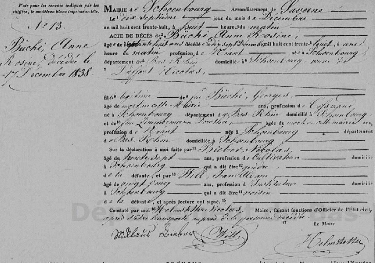 Pas de registre avant 1768Décès : 17 décembre 1838 à Schoenbourg 67320 Alsace ( Source )
