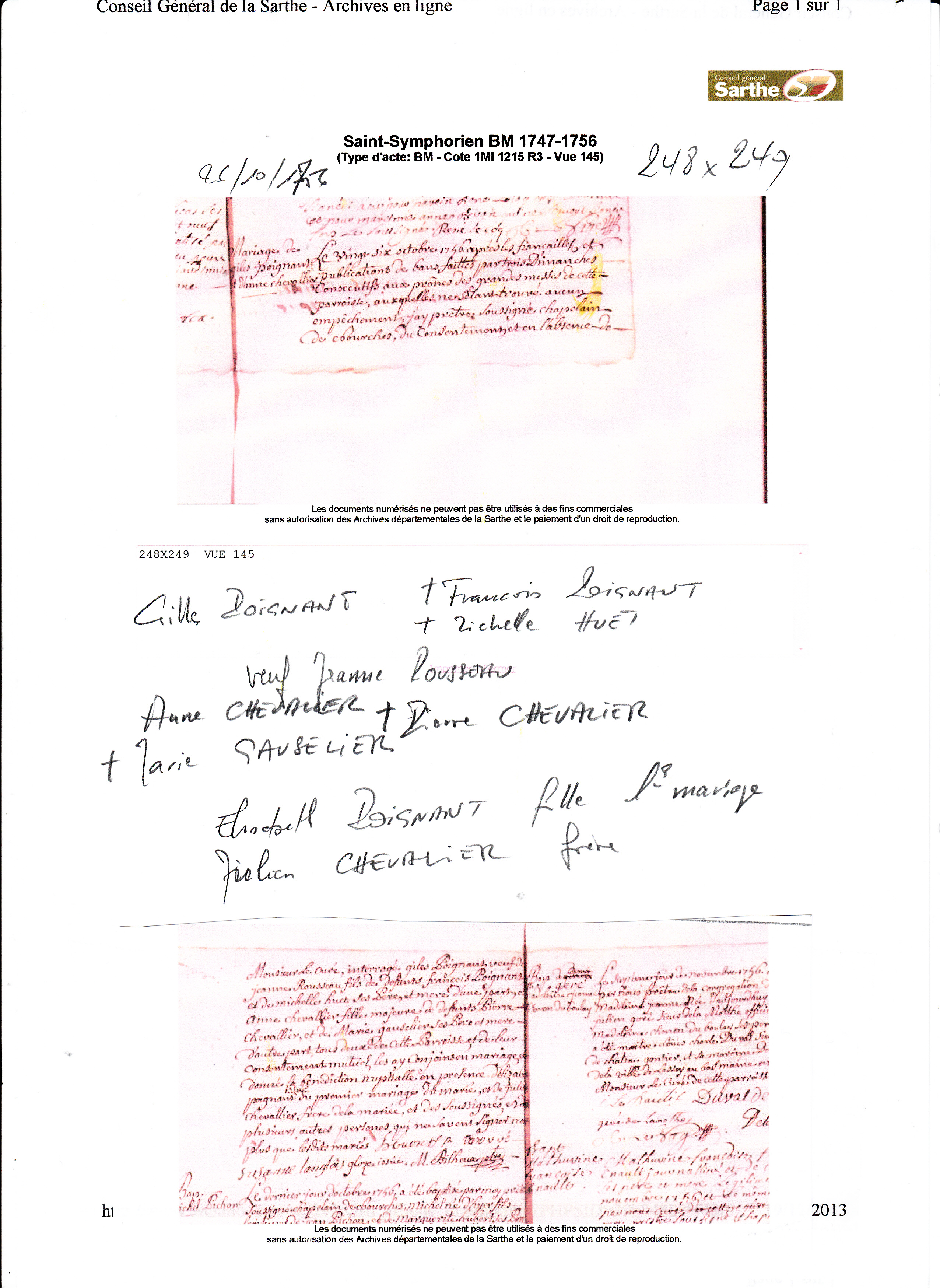 Mariage : 26 octobre 1756 à Saint Symphorien 72480 ( Source )