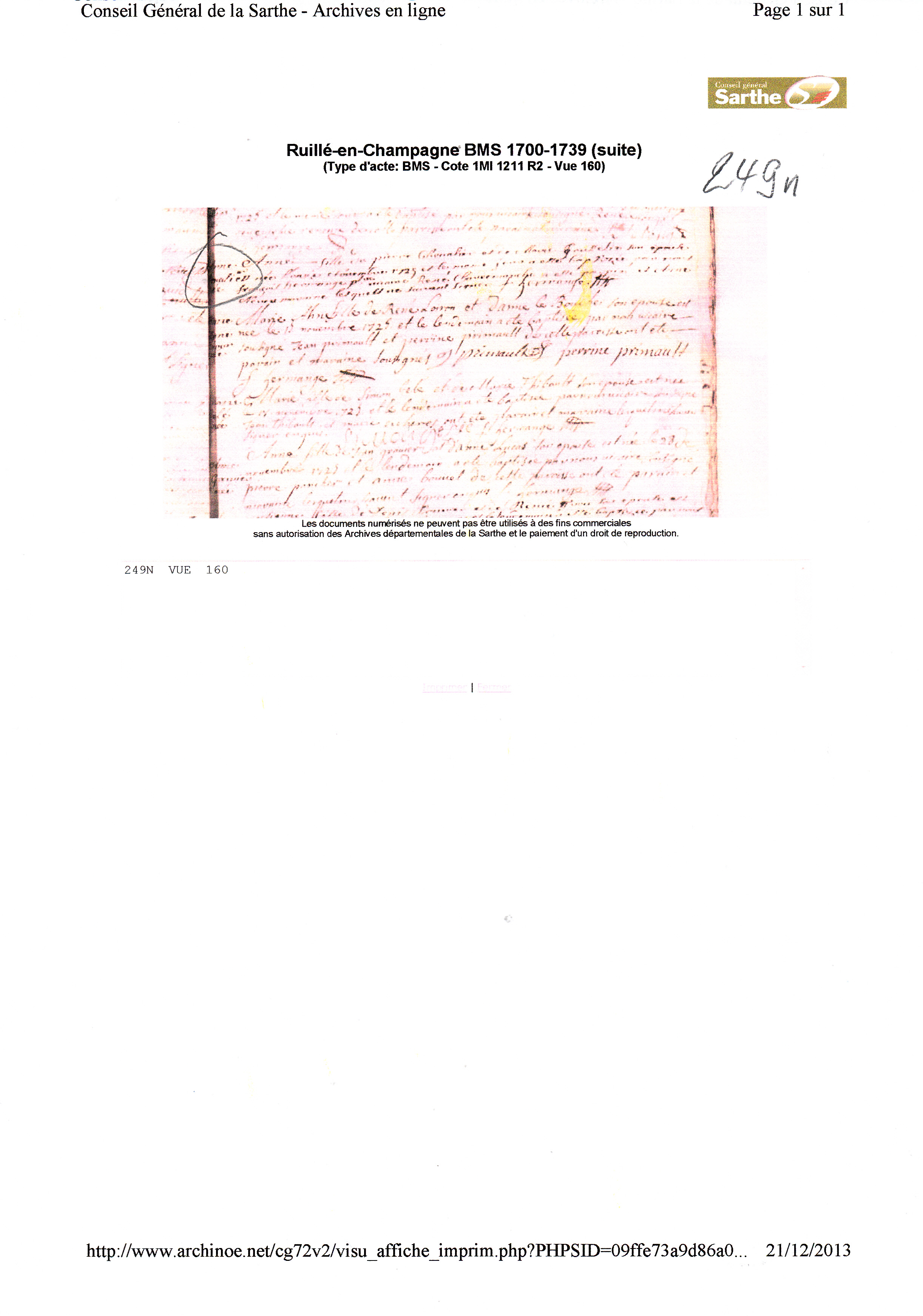 Mariage : 23 janvier 1725 à Ruille en Champagne 72240 ( Source )