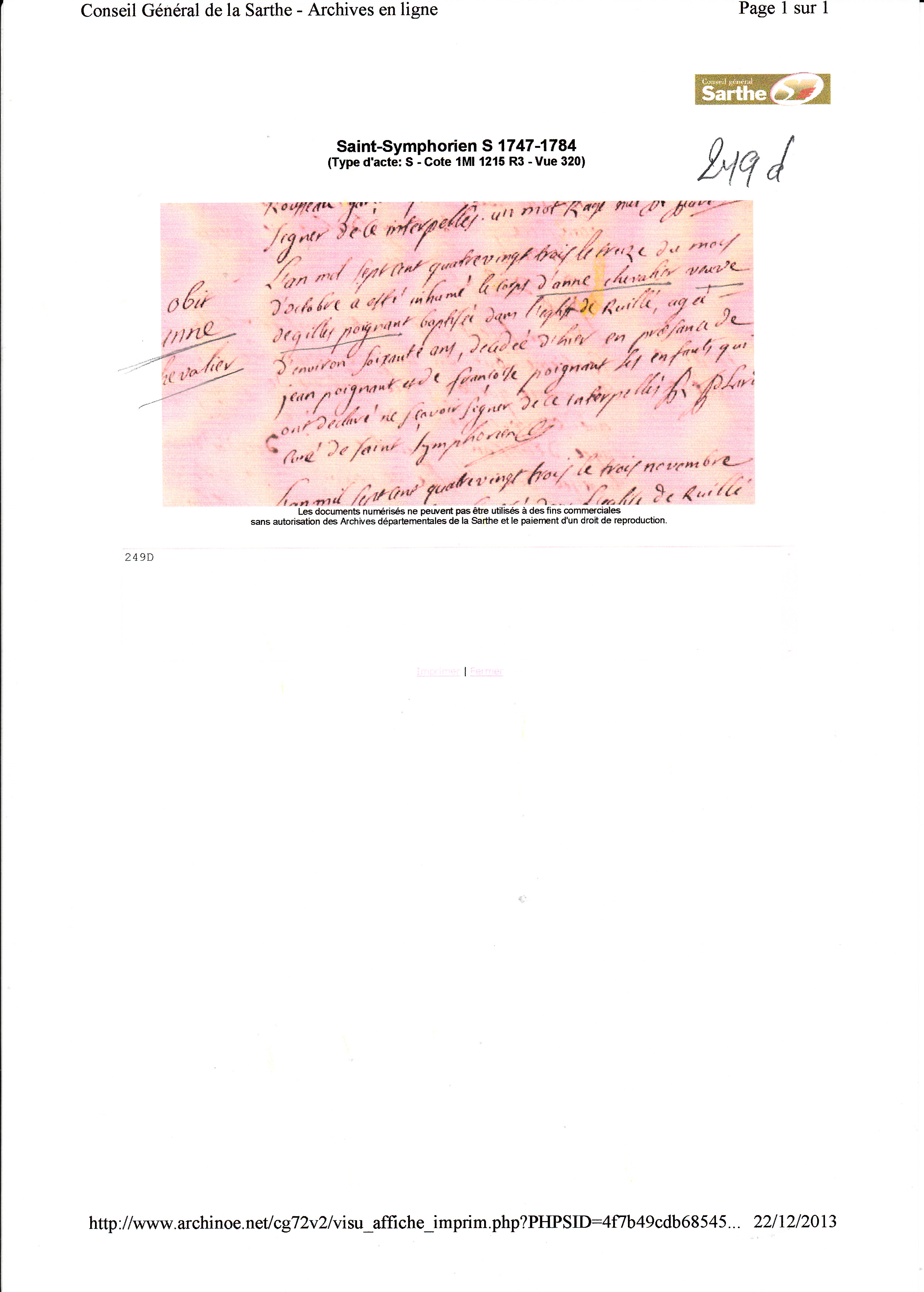 Décès : 12 octobre 1783 à Saint Symphorien 72480 ( Source )