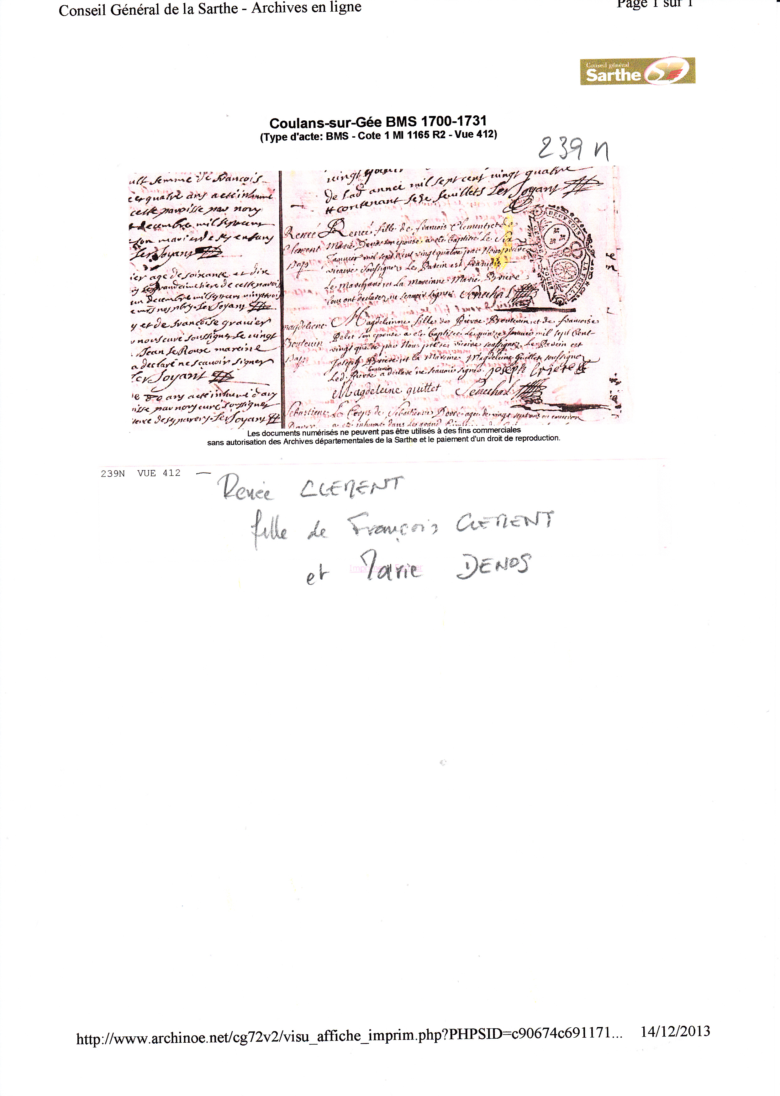 Naissance : 6 janvier 1724 à Coulans-sur-Gée 72550 ( Source )