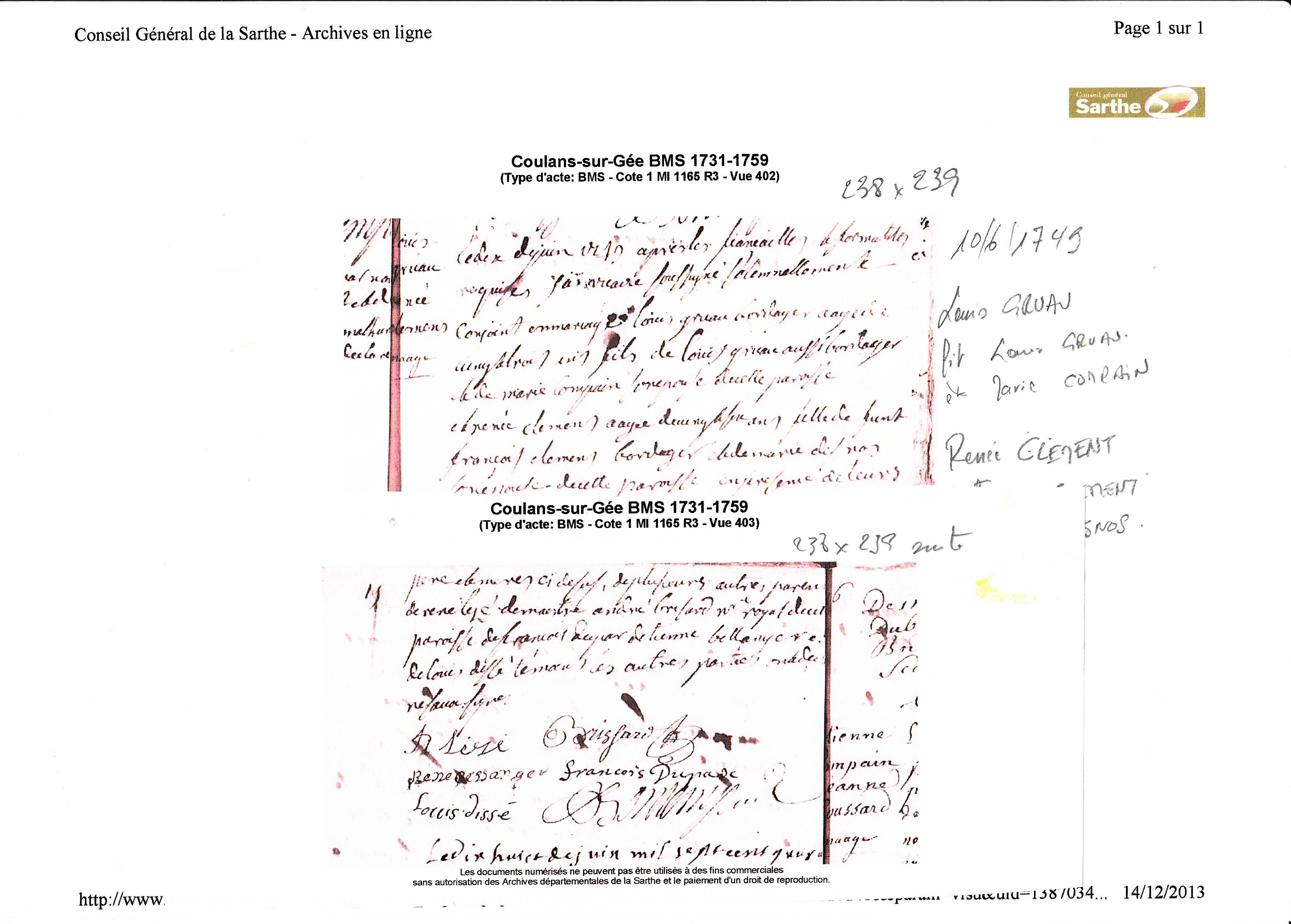 Mariage : 10 juin 1749 à Coulans-sur-Gée 72550 ( Source )
