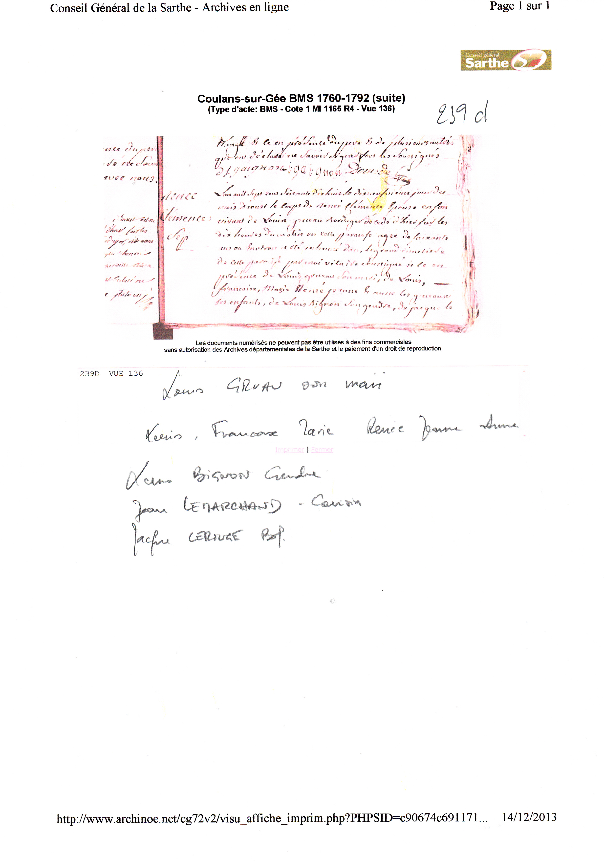 Décès : 18 août 1778 à Coulans-sur-Gée 72550 ( Source )