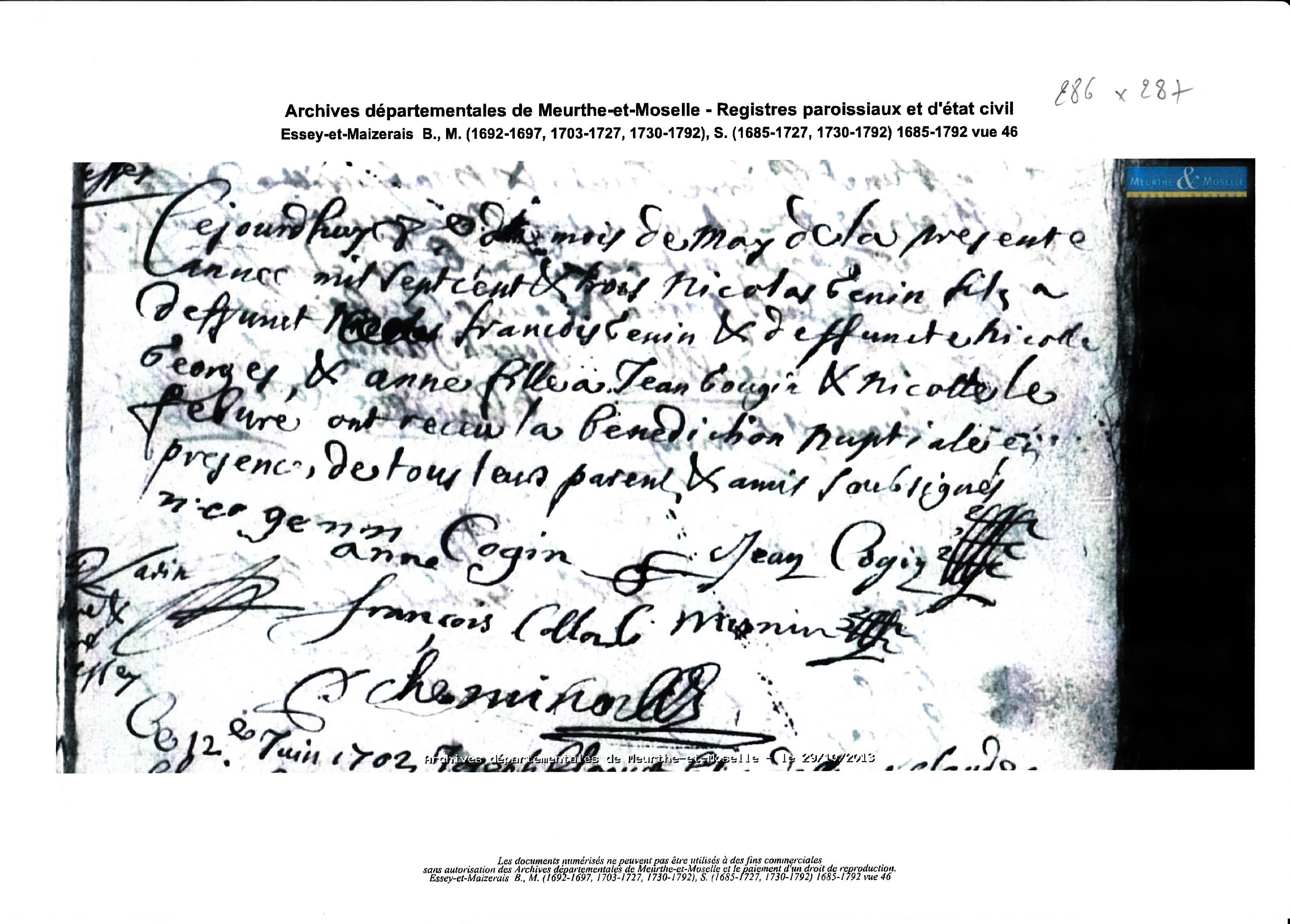 Mariage : 8 mai 1703 à Essey et Maizerais 54470 ( Source )