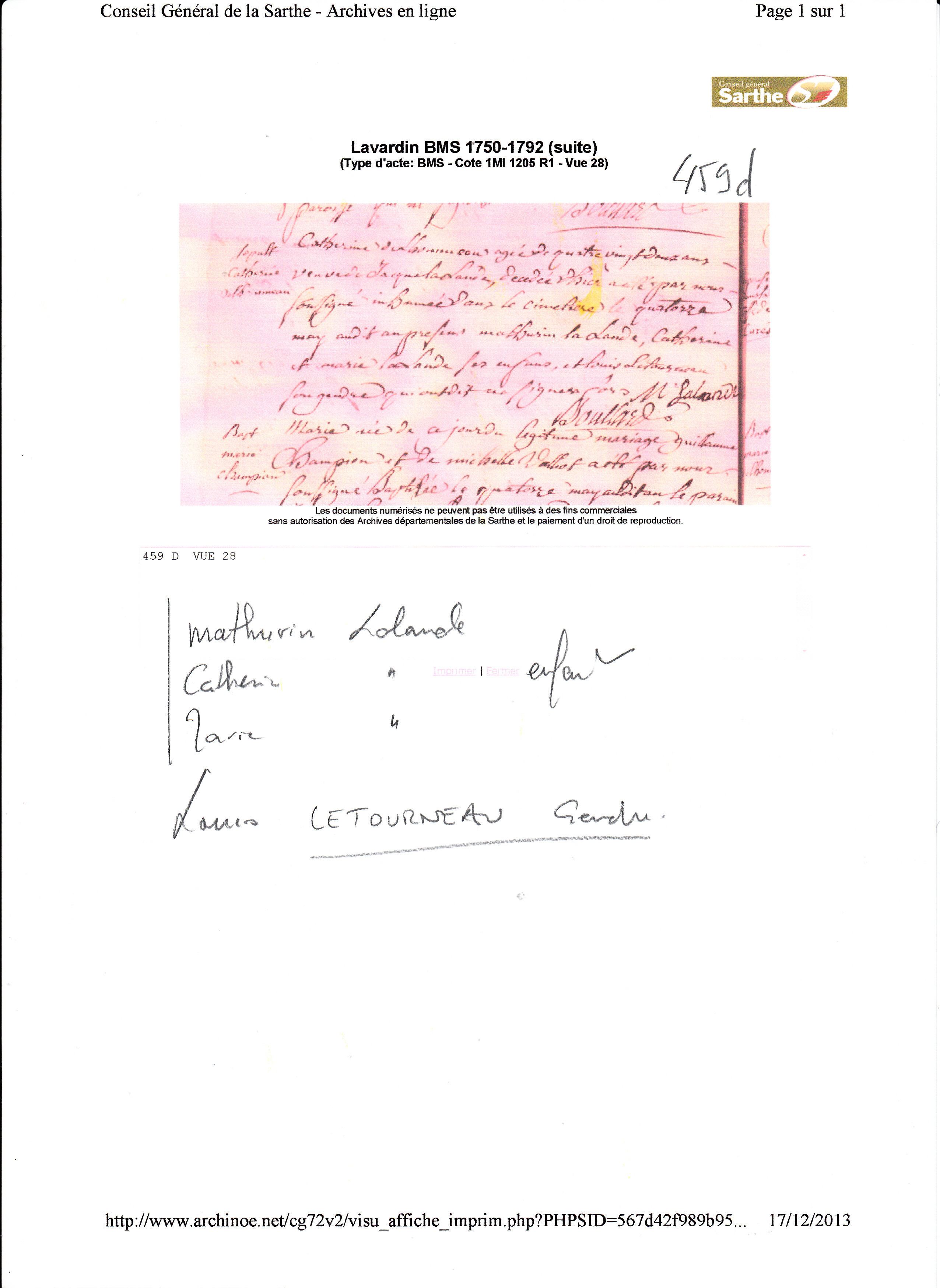 Décès : 13 mai 1769 à Lavardin 72240 ( Source )