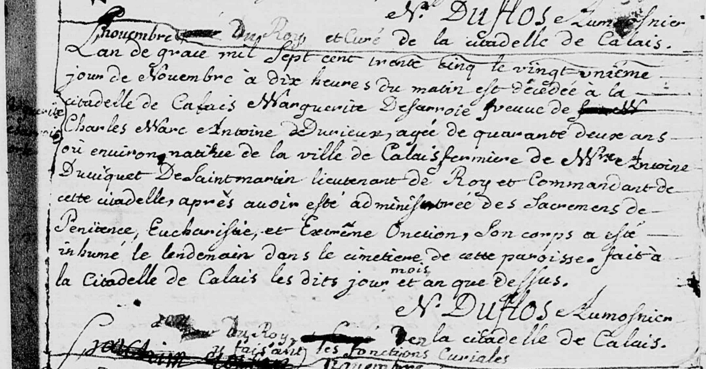 Décès : 21 novembre 1735 à Calais la Citadelle 62100 ( Source )