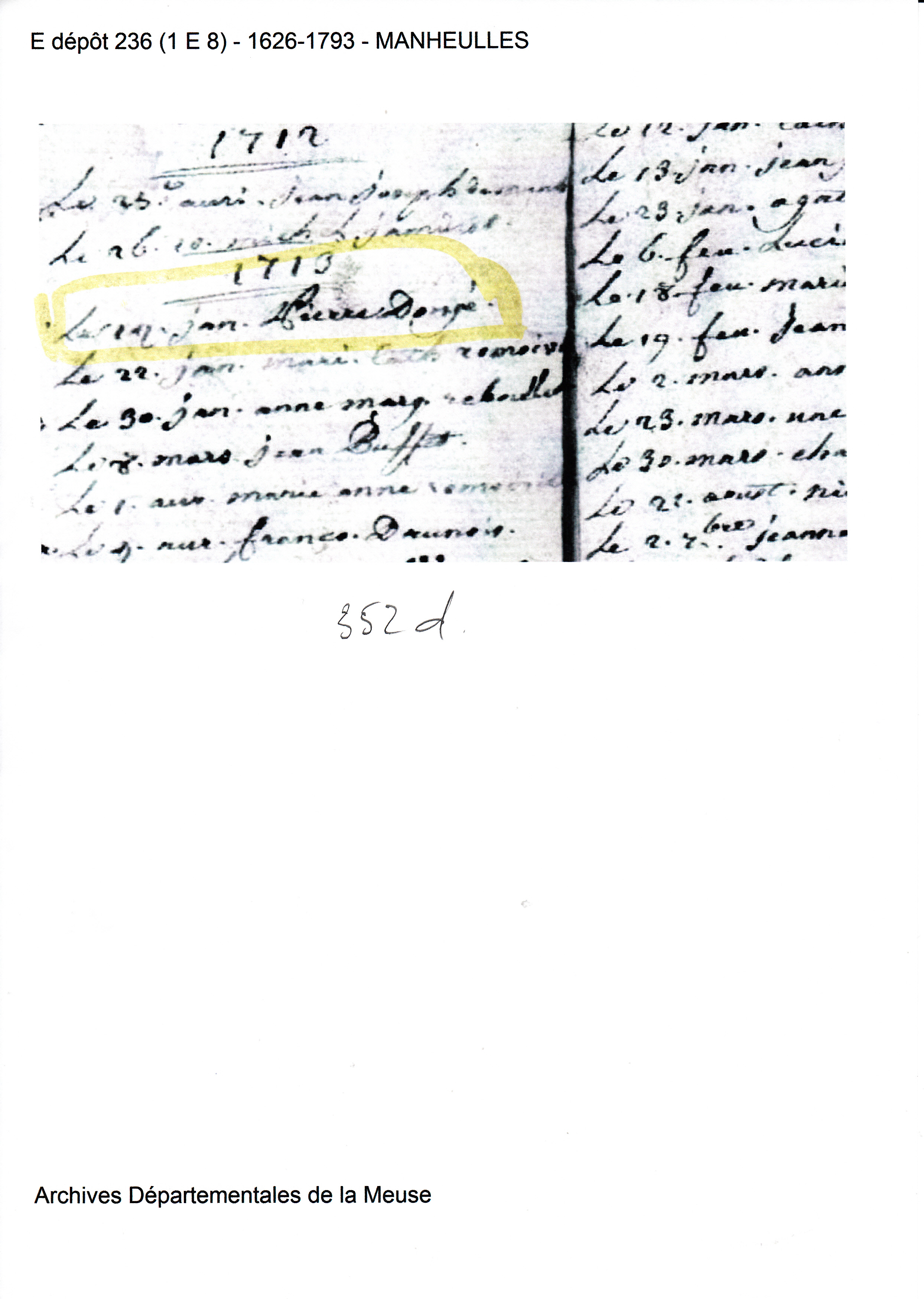 Naissance : vers 1675 Décès : 12 janvier 1713 à Manheulles 55160 ( Source )