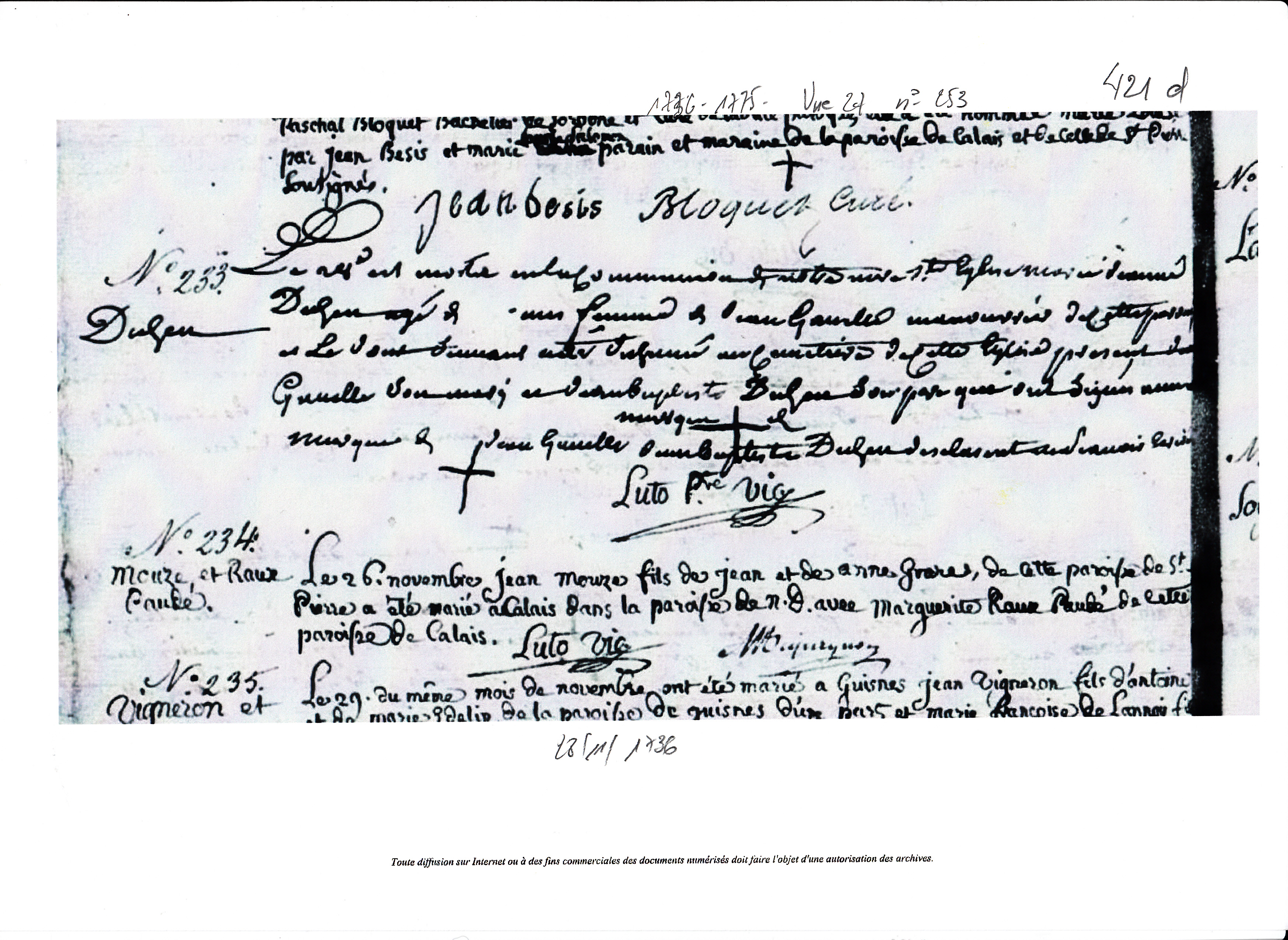 Mariage : 24 janvier 1728 à Calais Saint Pierre 62100 ( Source )