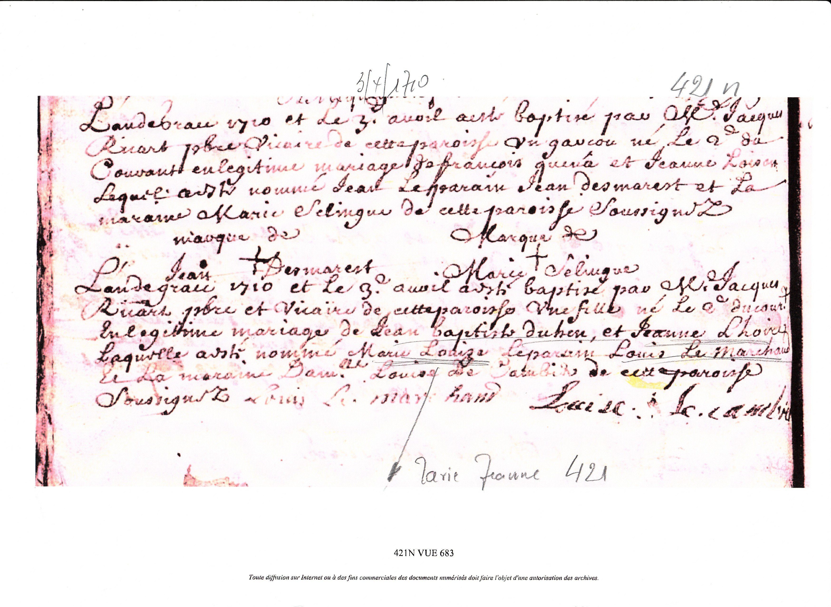 Naissance : 2 avril 1710 à Calais Saint Pierre 62100 ( Source )