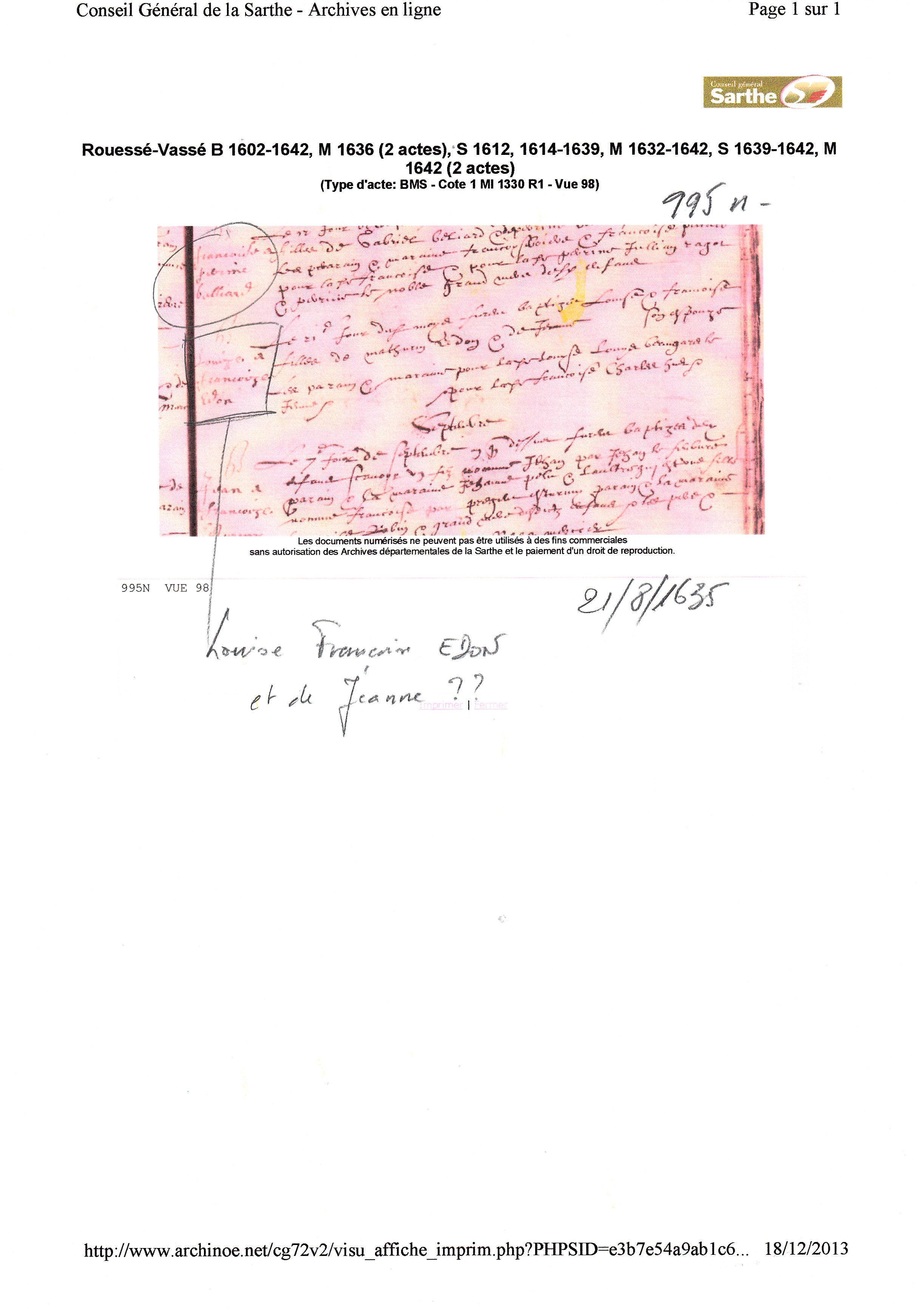 Naissance : 21 août 1635 à Rouessé-Vassé 72140