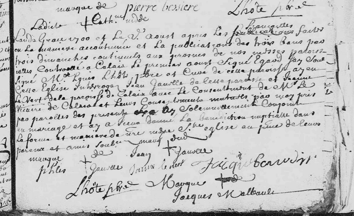 Mariage : 2 août 1700 à Calais Saint Pierre 62100 ( Source )