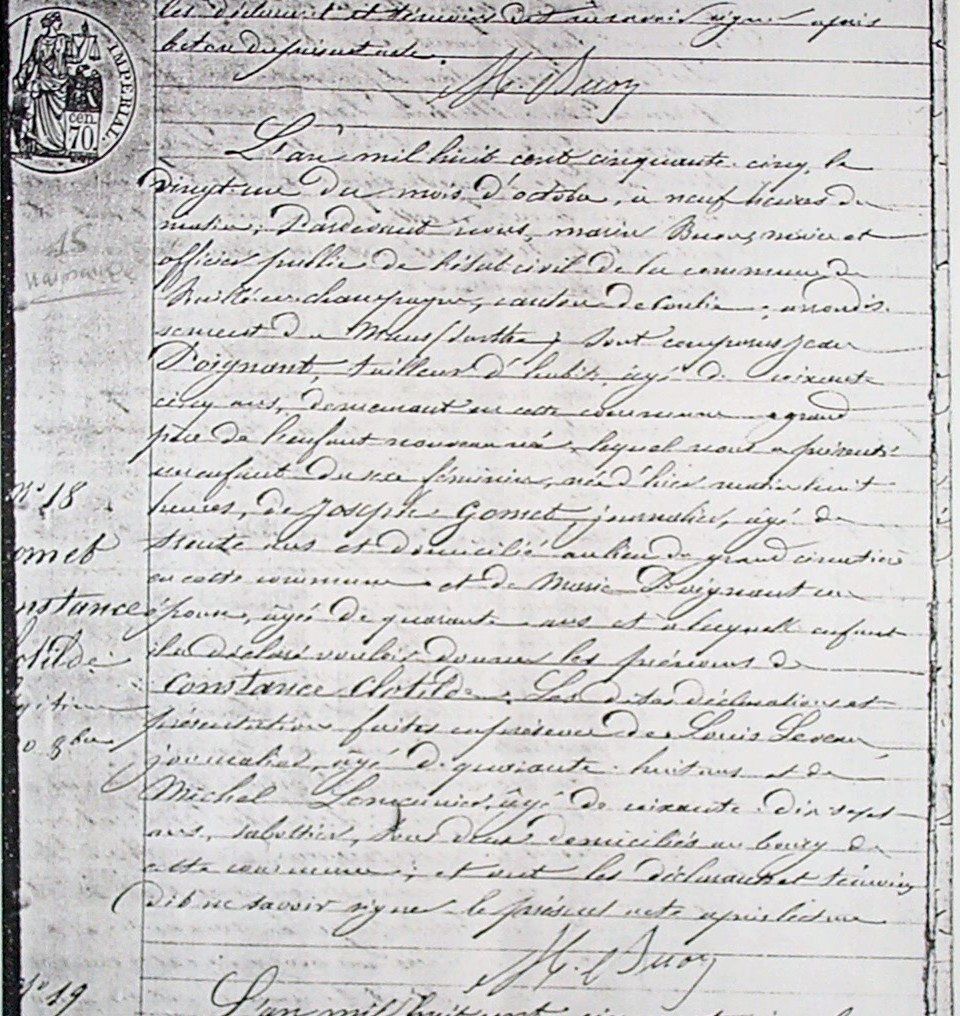 Louis GOMER, bordager, fils de feu Louis GOMER et de feue Françoise BOUVET, a épousé Claudine BRETTEAU, de Tennie, fille de Michel BRETTEAU et de feue Claudine LEFAUCHEUX, le 7/9/1767 à Saint Symphorien. Le marié assisté de Joseph Gomer son son frère germain et de sa belle-sœur Françoise Soury épouse dudit Gomer. La mariée assistée de son père, de Marie Bretteau épouse de Léonard Quéru sa sœur germaine, d'Urbain, Louis, Michelle, épouse de Michel Gautier aussi présent, Louise et Marie Breteau ses frères et sœurs consanguins, neveux et nièces.