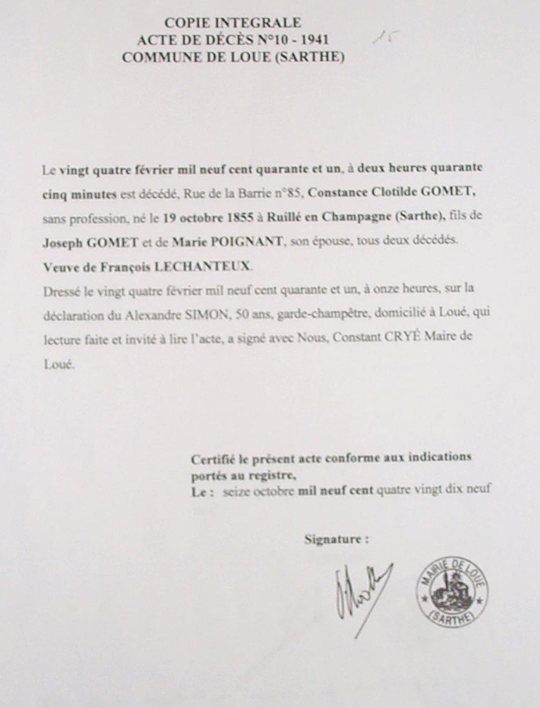 Décès : 24 février 1941 à Loue 72540 ( Source )