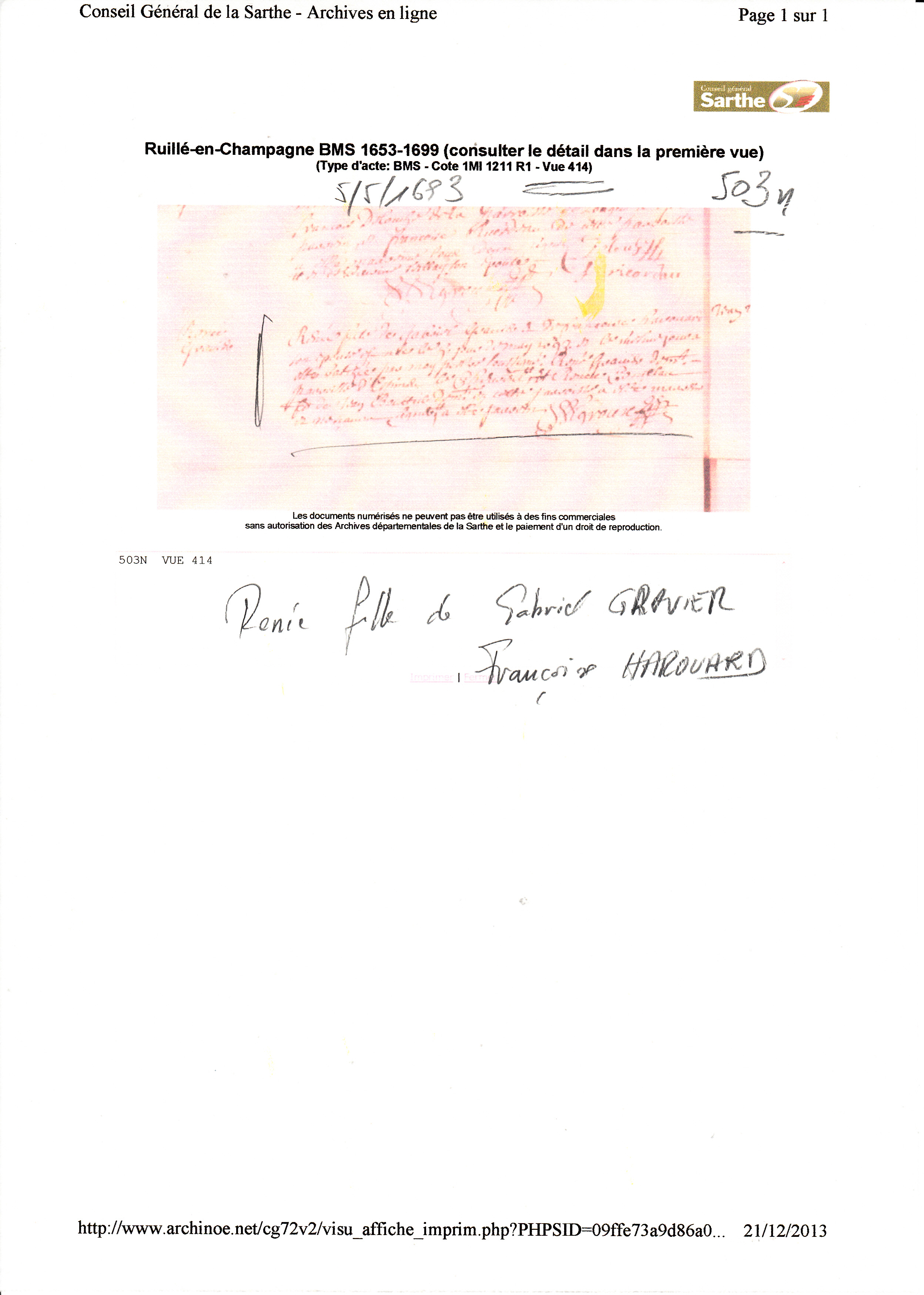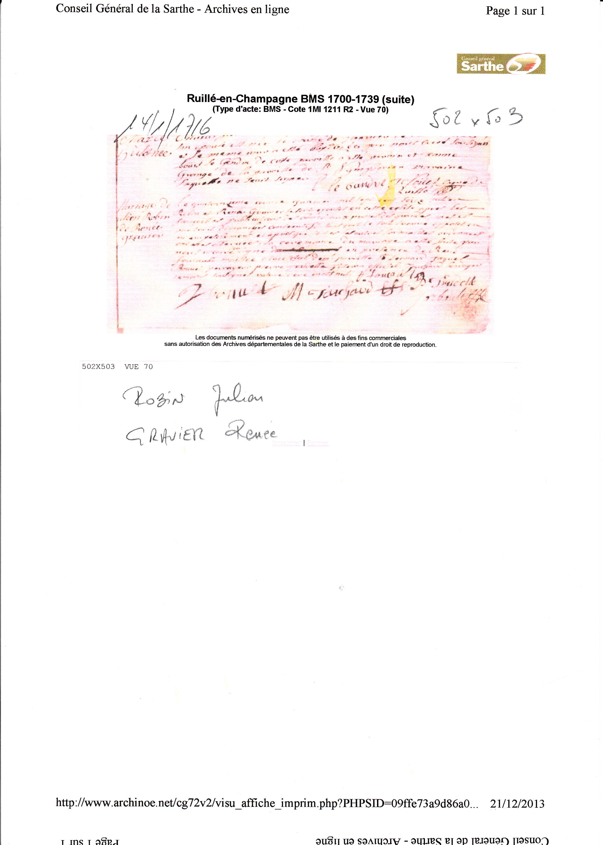 Mariage : 14 janvier 1716 à Ruille en Champagne 72240 ( Source )