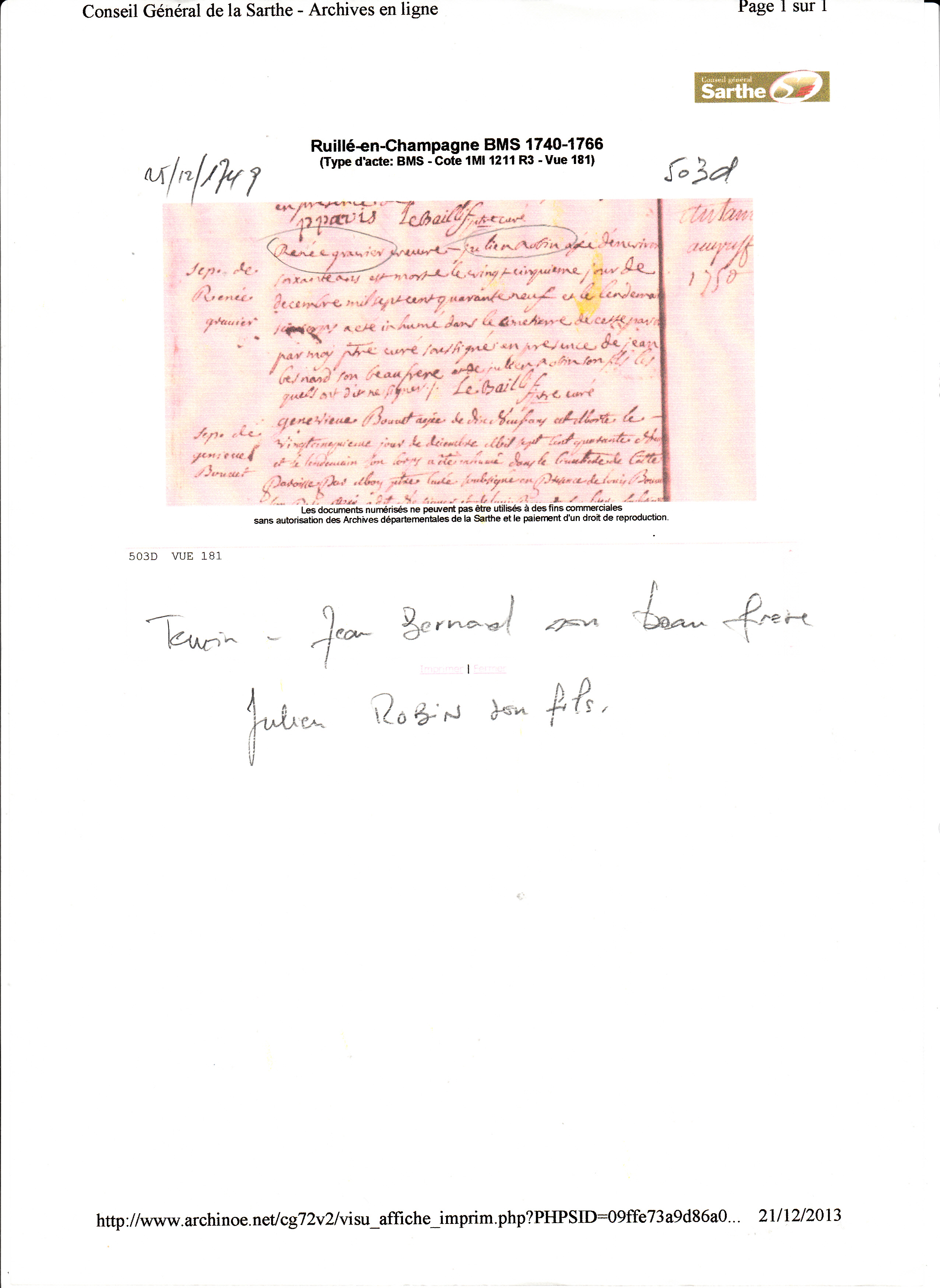 Décès : 25 décembre 1749 à Ruille en Champagne 72240 ( Source )