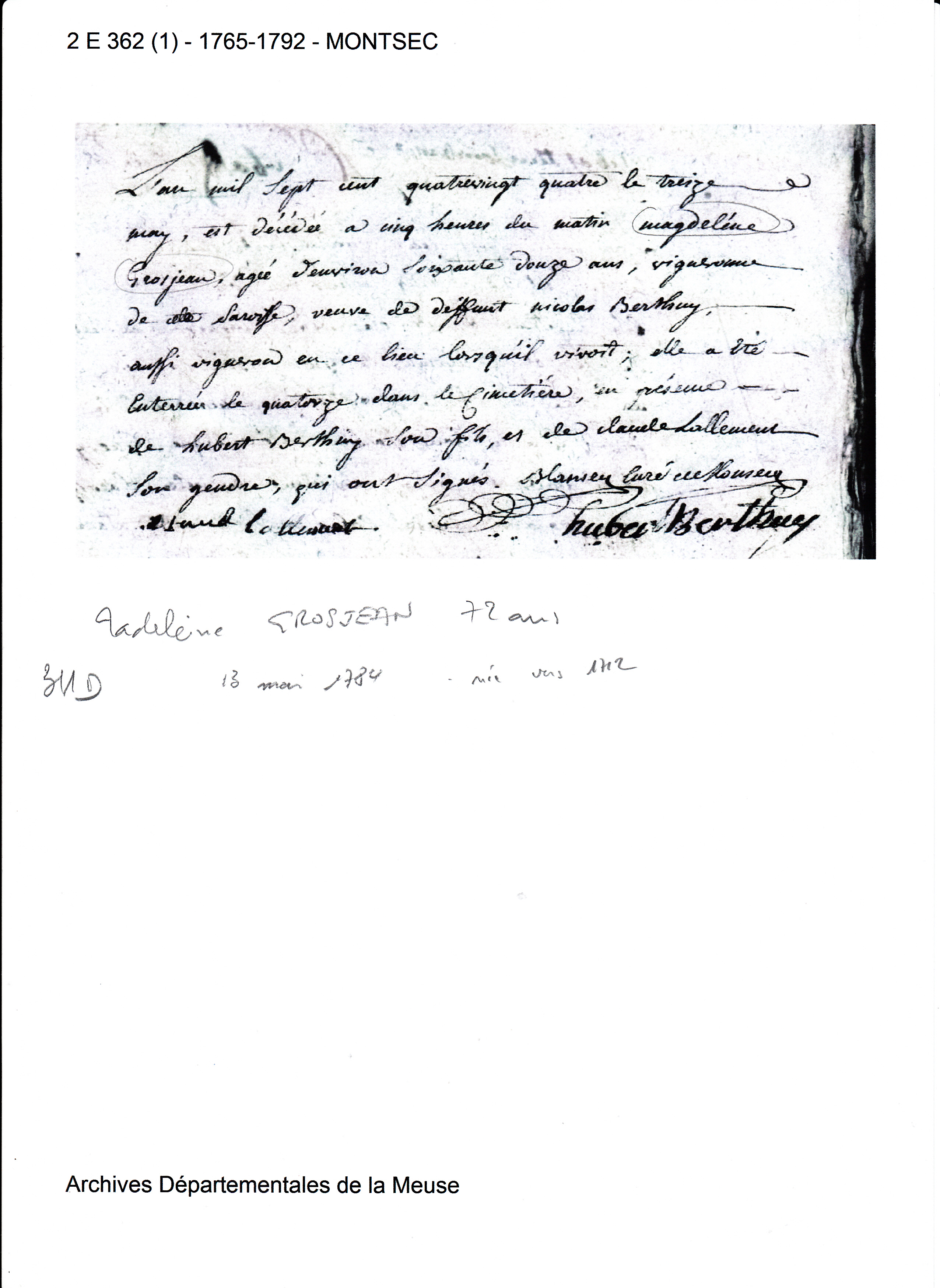 Décès : 13 mai 1784 à Montsec 55300 ( Source )