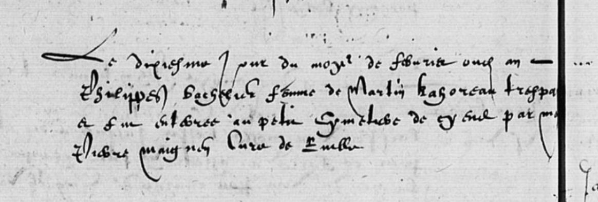 16 octobre 1673 : Décès - Diemeringen, 67430, Bas Rhin, Alsace, France Transcription de l'acte : N[ota] B[ene] Den 16. Octobris 1673 ist 0ttilia Enßmingerin, Wittib, sonst vulgo Gerber Ottel, Elßbeth, Niclaß Hänels des Un- ter Portners Frau, beide von hier, item von Dehlingen Hans Köppels des Wirts Weib namens Walpurgis, desgleichen Lovys Jenins Frau, Gertrud ; auch Ulrich Kieffers Weib Applonia, und Anstett Hemmerts Frau Margretha, der Zauberey halben, mit dem Schwert geauptet und die Körper beim Galgen verbrannt worden. Traduction de l'acte: N.B.: Le 16 octobre 1673, Ottilia Enssminger, veuve appelée communément Gerber Ottel, Elßbeth, épouse du gardien de la Porte Basse (UnterPortner) Niclaß Hänel, tous deux d'ici, de même la femme de l'aubergiste Hans Köppel de Dehlingen, nommée Walpurgis, de même, Gertrud, femme de Louys Jenin; aussi Appolonia, femme d'Ulrich Kieffer, et Margretha, femme d'Anstett Hemmert, ont été décapitées par l'épée pour sorcellerie et les corps ont été brûlés près du gibet.