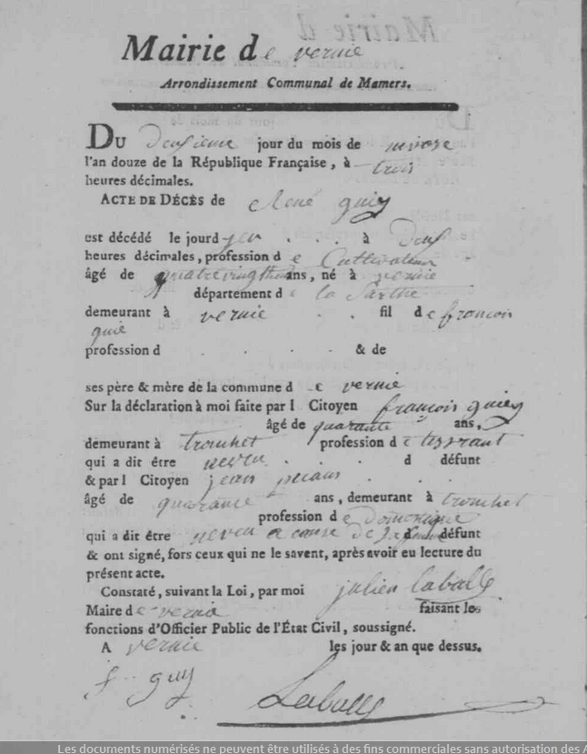 Décès : 24 décembre 1803 à Vernie 72170 ( Source )