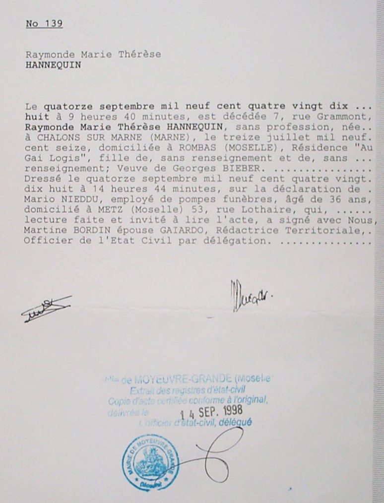 Décédée des suites d'une nème attaque cérébrale à l'hôpital de Moyeuvre Grande