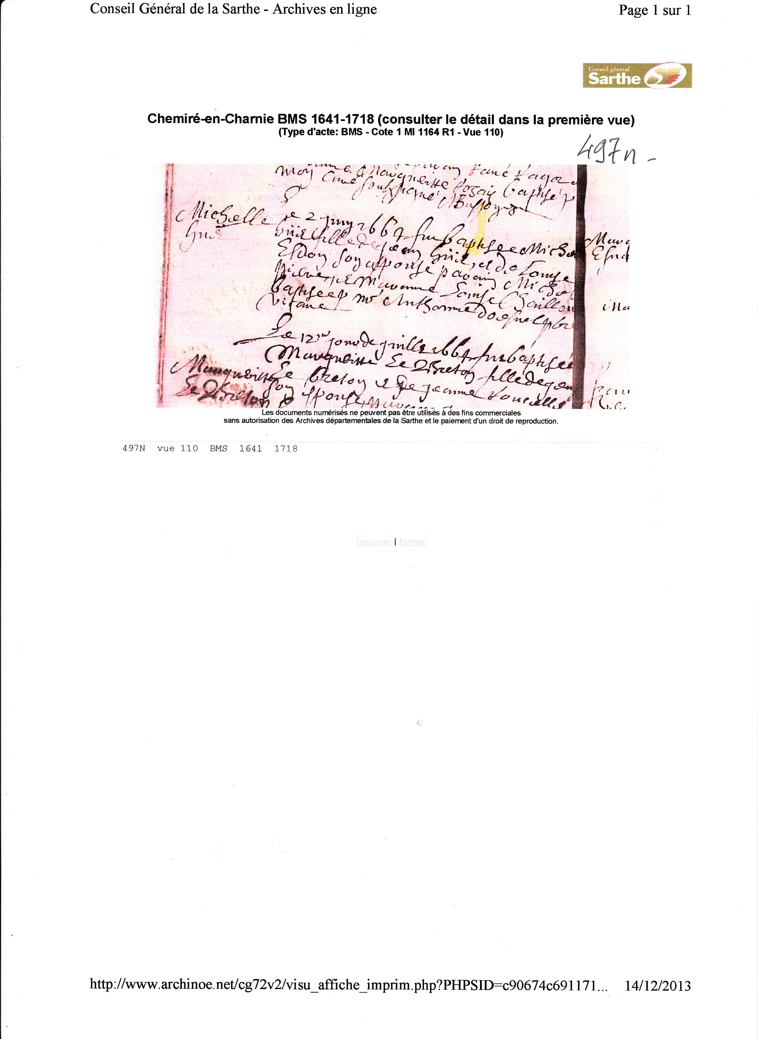 Naissance : 2 juin 1664 à Chemiré en Charnie 72540 ( Source )