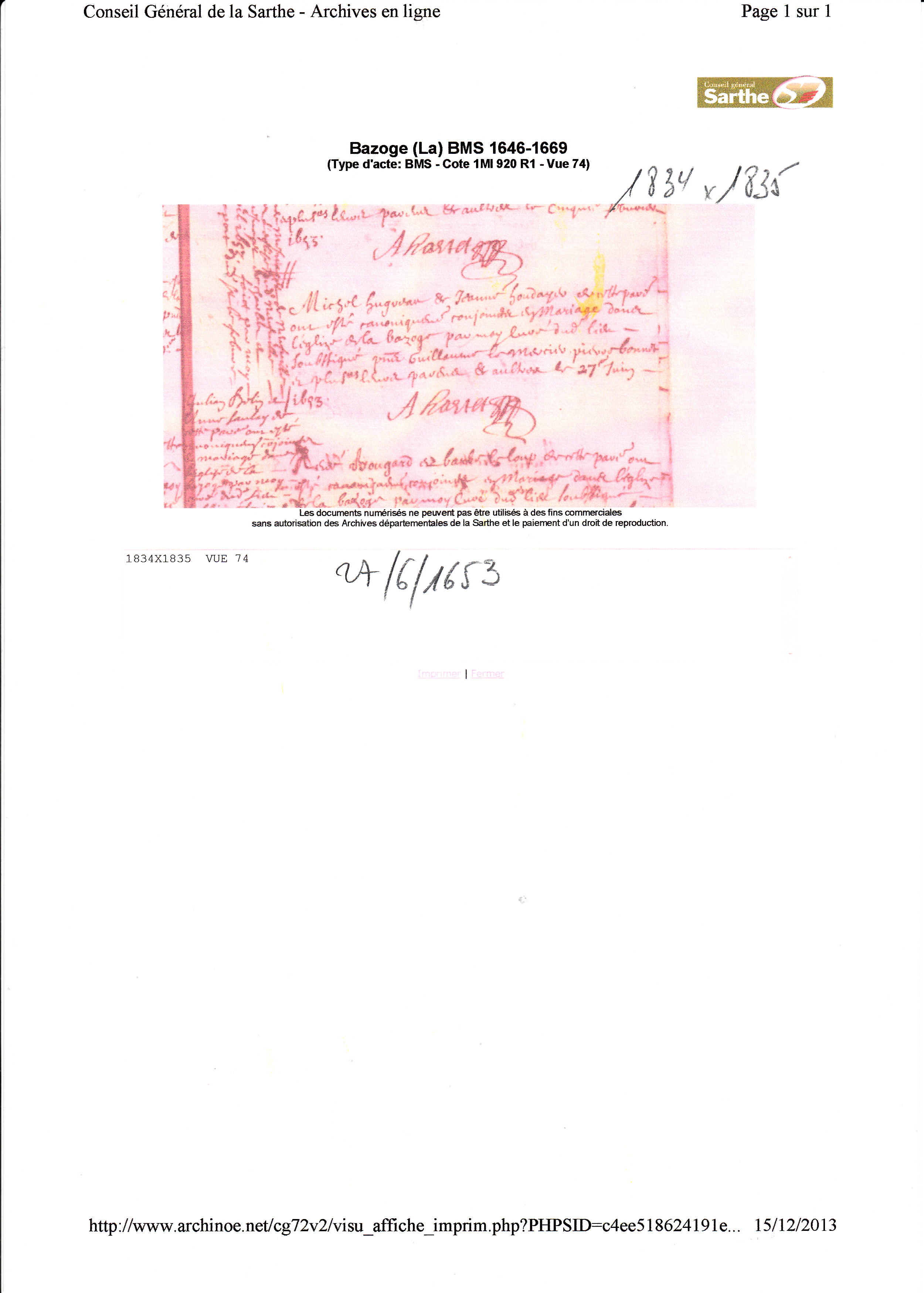 Mariage : 27 juin 1653 à La Bazoge 72650 ( Source )