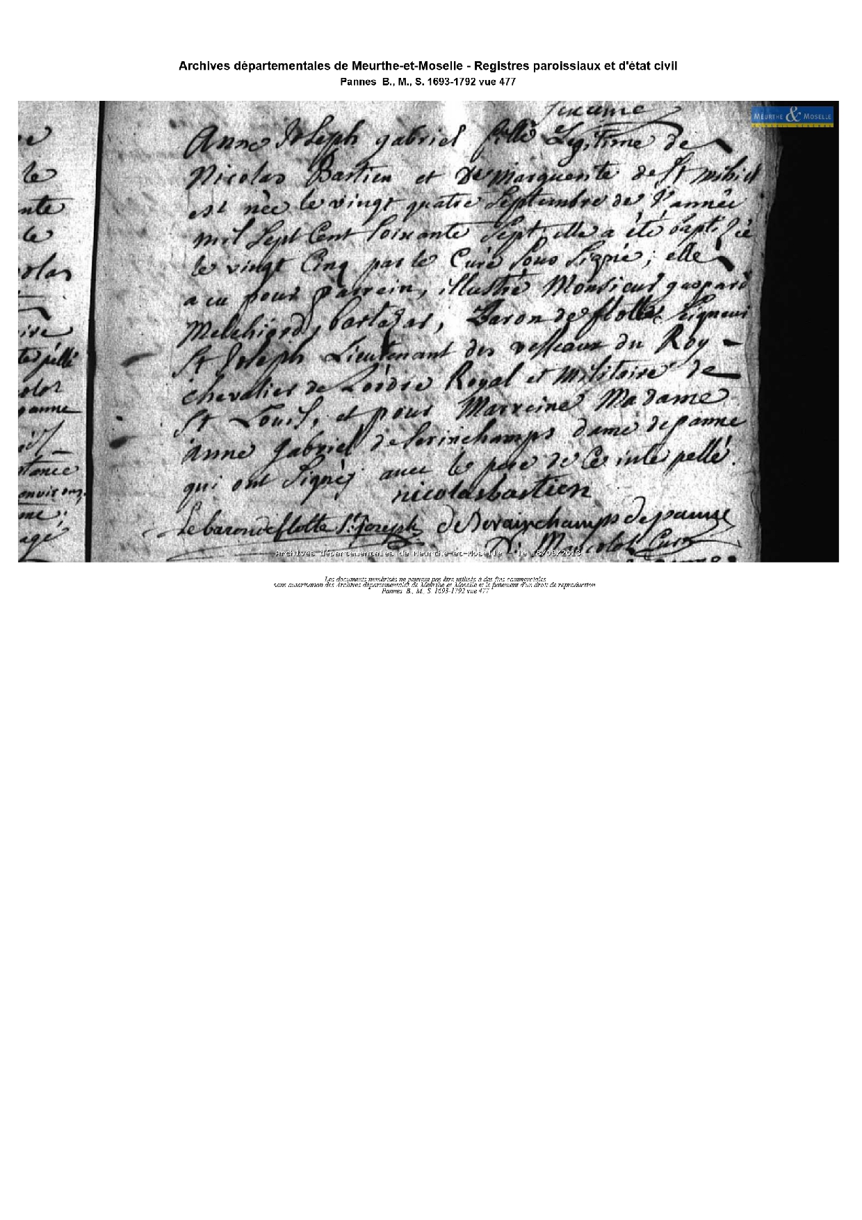 A pour parrain illustre Gaspard Melchior XXXX barron de Flotte yyyyySt Joseph, lieutenant des vaisseaux du roy, chevalier de l'ordre royal et militaire et pour marraine Anne Gagrielle de Seichamps, dame de Pannes