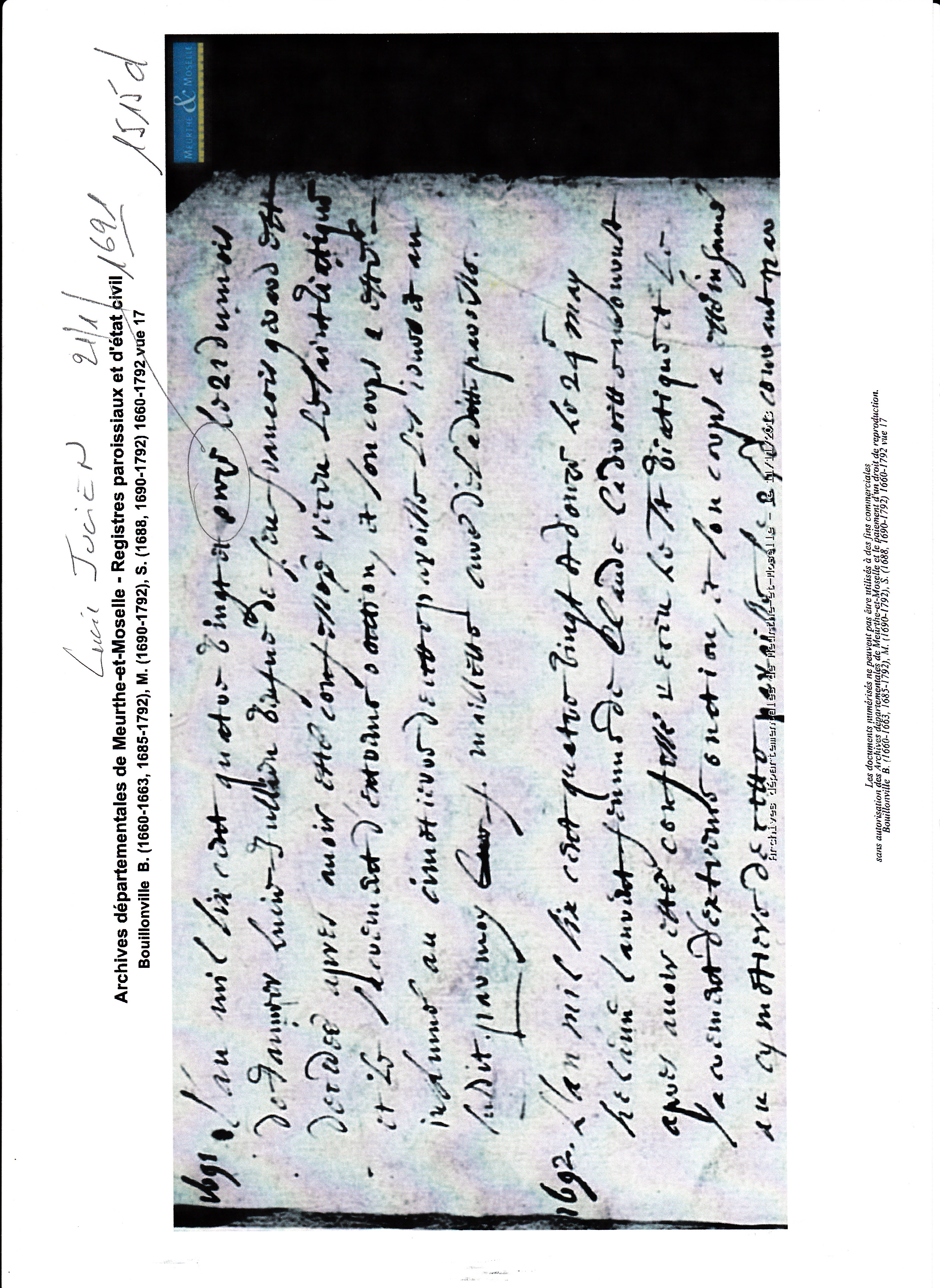 Naissance : Décès : 21 janvier 1691 à Bouillonville 54470 ( Source )