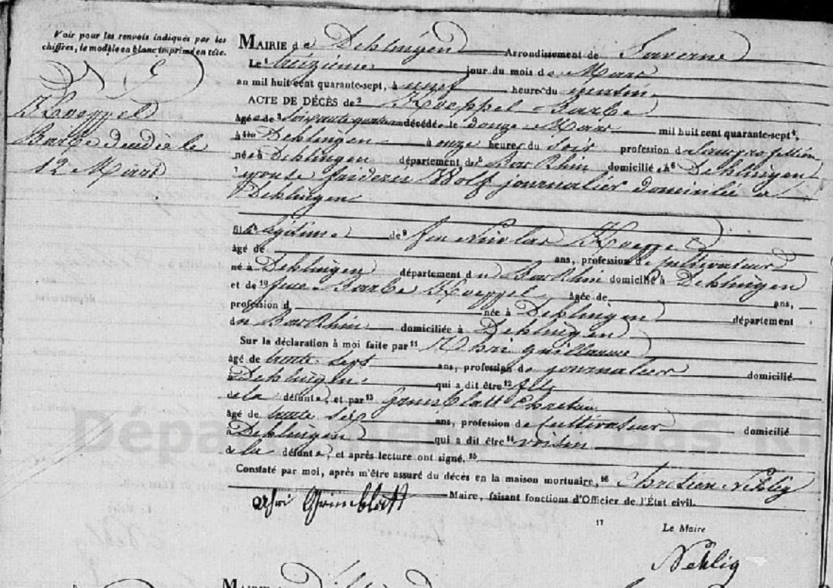 Décès : 12 mars 1847 à Dehlingen 67430 Alsace ( Source )