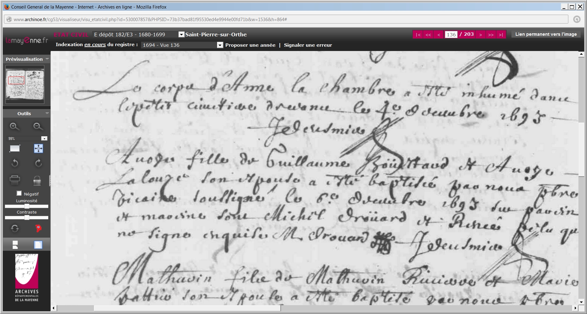 Naissance : 16 janvier 1637 à Saint-Thomas-de-Courceriers 53160 ( Source )