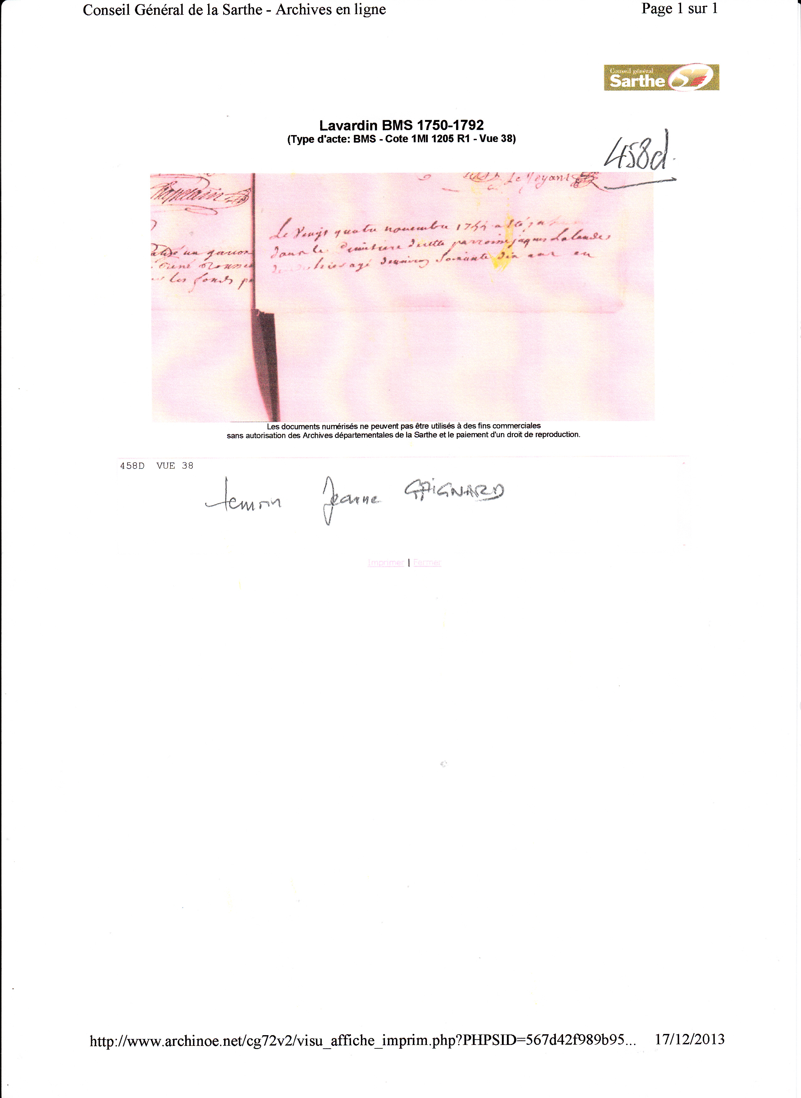 Décès : 23 novembre 1755 à Lavardin 72240 ( Source )