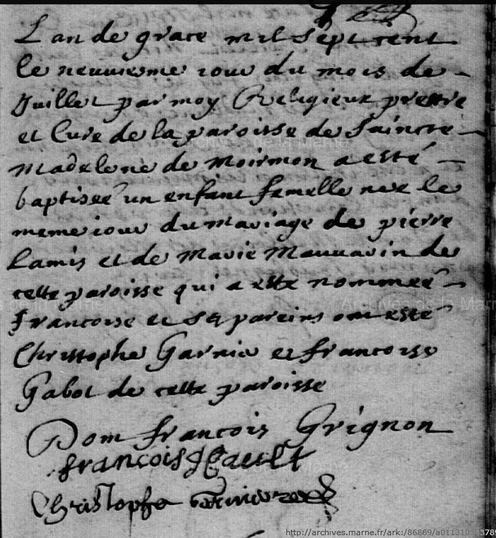 Naissance : 9 juillet 1700 à Moiremont 51 ( Source )