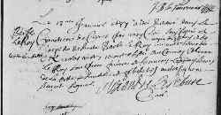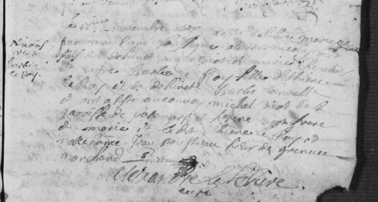 c.d.m. de Robert NOEL filsde Robert NOEL et Marie VAUCHEL ...... et Antoinette Le ROYjeune fille à marier assistée de Claude FLAHAUT et Marguerite FRAMERY auparavant veuve de Jean Le ROY, père de ladite Antoinette, Antoine Le ROY son oncle, du côté maternel, Jacques et Antoine Le ROY ses frères, Jacqueline Le ROY, sa soeur, et autres ......