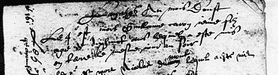 il teste à St Omer le 23/01/1592 ( acte N°3) réfugié en cette ville de St Omer lui et sa femme Jehenne de SOMELAIRE; Il souhaite être inhumé en l'église de Licques "s'il y a moyen ou autre lieu à la commodité du temps" Héritiers: son fils ainé Jehan LE ROY déjà marié, ses autres enfants Anthoine, Jehenne et Jossine LEROY, sa fille Michelle LE ROY femme de Jehan WATBLED, son fils maisné (mineur) Anthoine LE ROY