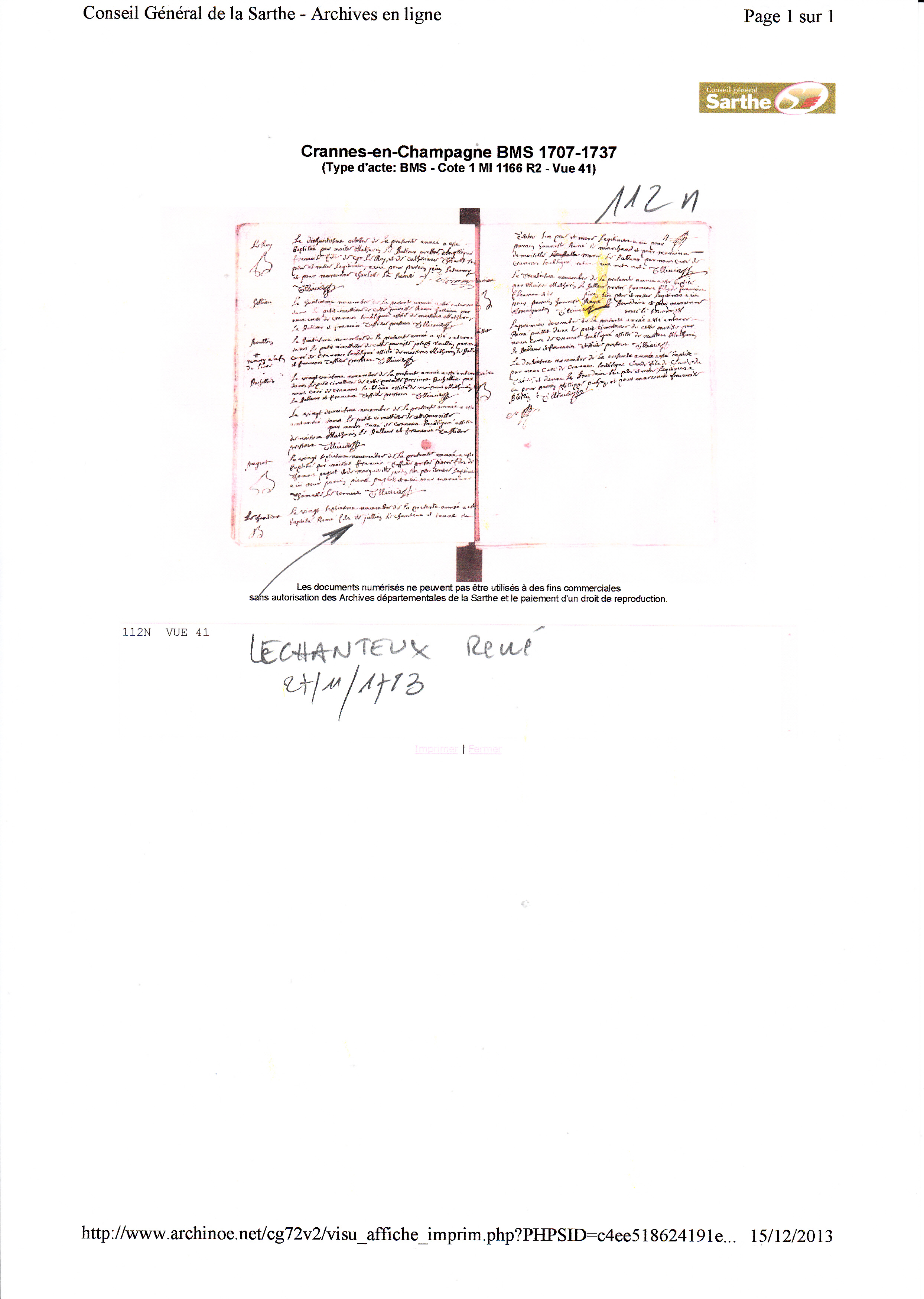Naissance : 4 avril 1712 à Crannes-en-Champagne 72540