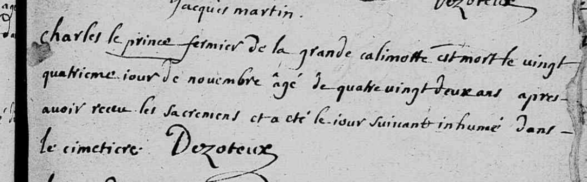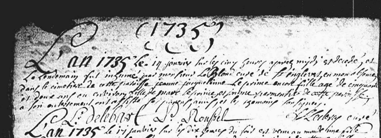 Le 14/1/1735 mort de Jeanne Jacqueline LEPRINCE fille de Marc LEPRINCE et de Jeanne PARMENTIER