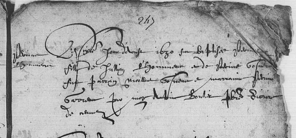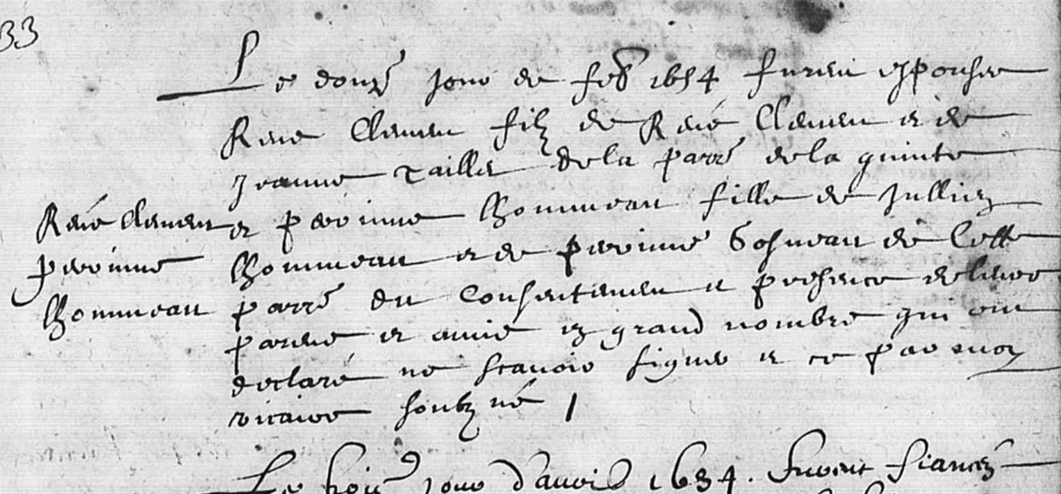 Perrine LHOMMEAU fille de Jullian LHOMMEAU, et de Perrine GOSNEAU est née le 10-8-1630 à Coulans-sur-Gée. Parrain, marraine, Nicollas Gosneau et Perrine Garreau. Vue 110/117 dans BS 1569-1599 (suite) 1 MI 1165 R1